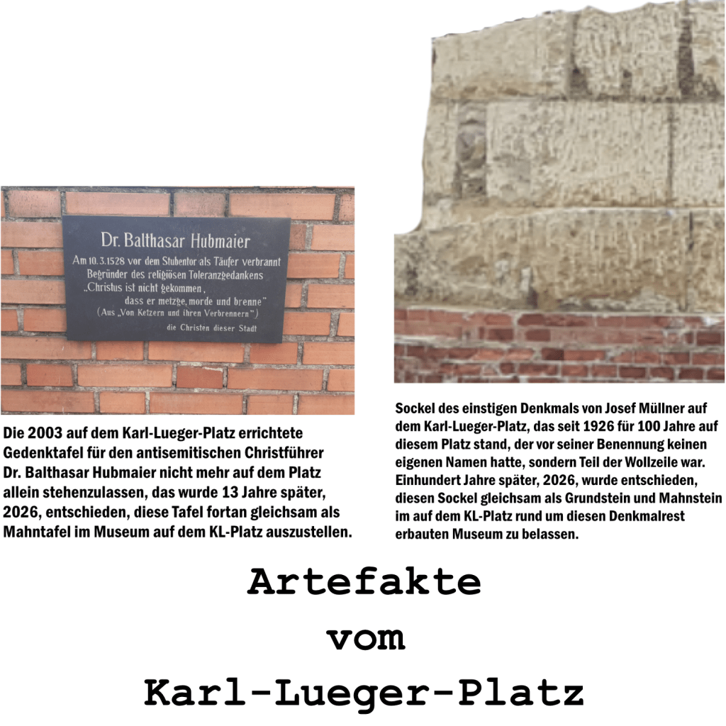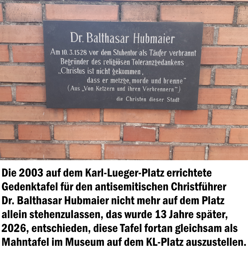 Davon ist nichts auf der Gedenktafel für Balthasar Hubmaier auf dem KL-Platz in Wien zu lesen, davon ist auch nichts auf der Website „Wien Geschichte Wiki“ zu lesen, jedenfalls bis zum heutigen Tag, 13. März 2026 —