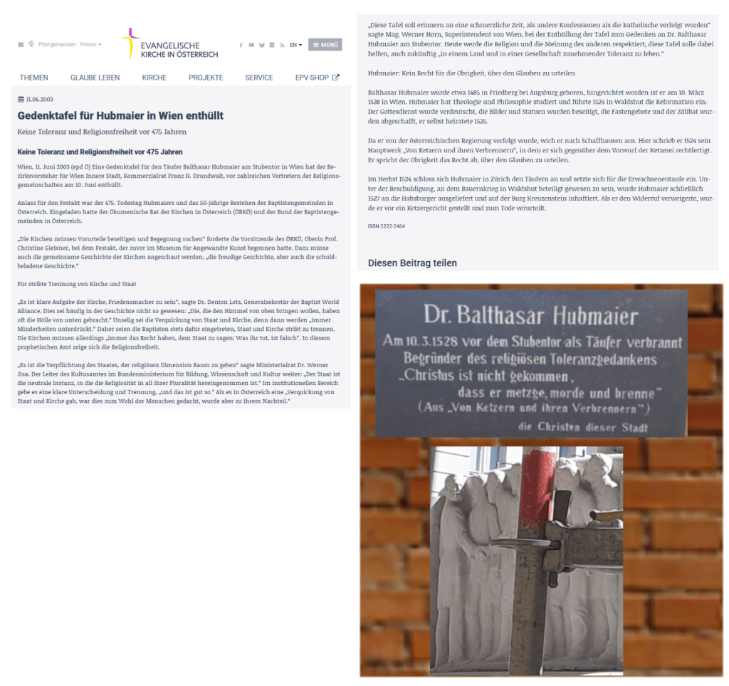 „Diese Tafel soll erinnern an eine schmerzliche Zeit, als andere Konfessionen als die katholische verfolgt wurden“ sagte Mag. Werner Horn, Superintendent von Wien, bei der Enthüllung der Tafel zum Gedenken an Dr. Balthasar Hubmaier am Stubentor. Heute werde die Religion und die Meinung des anderen respektiert, diese Tafel solle dabei helfen, auch zukünftig „in einem Land und in einer Gesellschaft zunehmender Toleranz zu leben.“