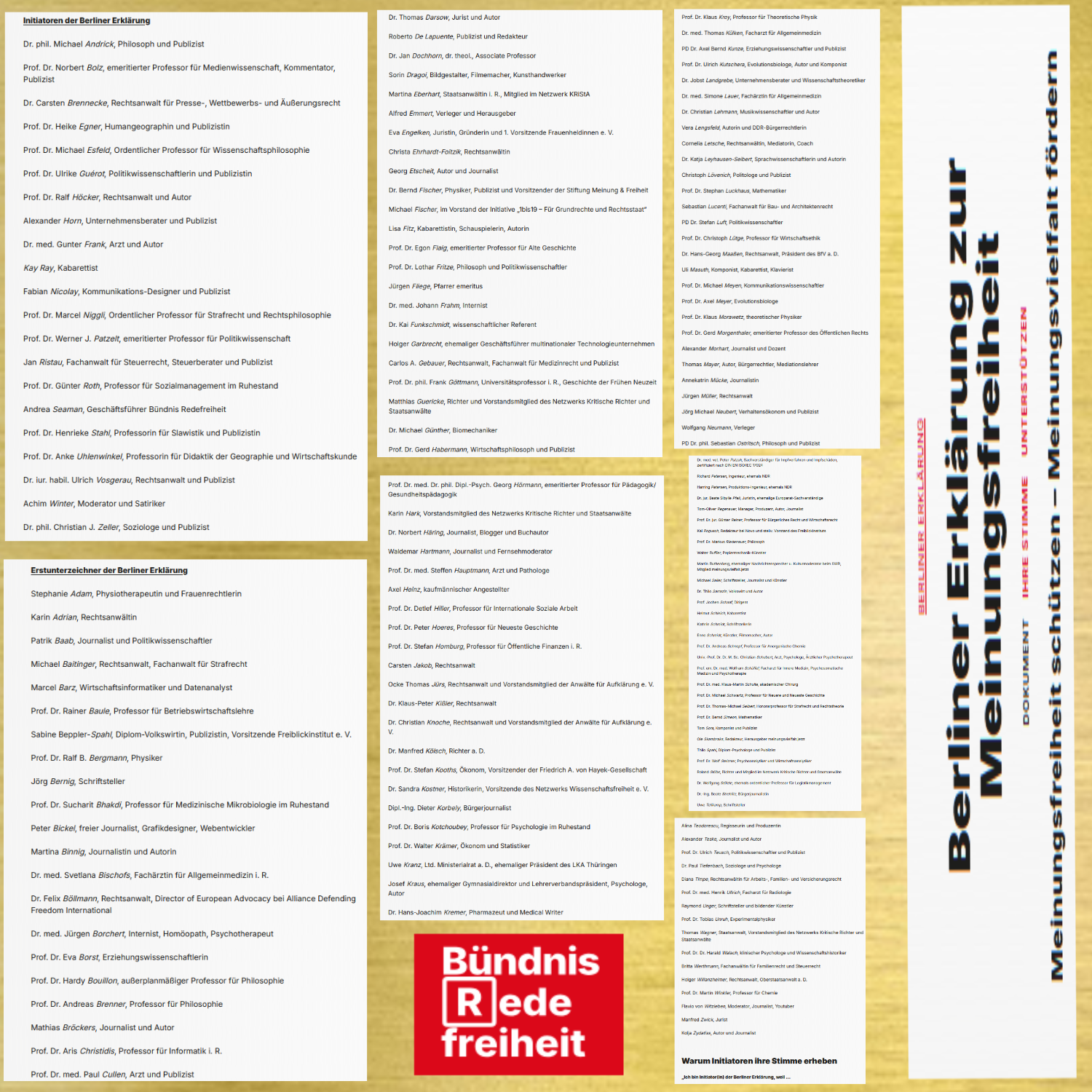Initiatoren der Berliner Erklärung: Dr. phil. Michael Andrick, Philosoph und Publizist; Prof. Dr. Norbert Bolz, emeritierter Professor für Medienwissenschaft, Kommentator, Publizist; Dr. Carsten Brennecke, Rechtsanwalt für Presse-, Wettbewerbs- und Äußerungsrecht; Prof. Dr. Heike Egner, Humangeographin und Publizistin; Prof. Dr. Michael Esfeld, Ordentlicher Professor für Wissenschaftsphilosophie; Prof. Dr. Ulrike Guérot, Politikwissenschaftlerin und Publizistin; Prof. Dr. Ralf Höcker, Rechtsanwalt und Autor; Alexander Horn, Unternehmensberater und Publizist; Dr. med. Gunter Frank, Arzt und Autor; Kay Ray, Kabarettist; Fabian Nicolay, Kommunikations-Designer und Publizist; Prof. Dr. Marcel Niggli, Ordentlicher Professor für Strafrecht und Rechtsphilosophie; Prof. Dr. Werner J. Patzelt, emeritierter Professor für Politikwissenschaft; Jan Ristau, Fachanwalt für Steuerrecht, Steuerberater und Publizist; Prof. Dr. Günter Roth, Professor für Sozialmanagement im Ruhestand; Andrea Seaman, Geschäftsführer Bündnis Redefreiheit; Prof. Dr. Henrieke Stahl, Professorin für Slawistik und Publizistin; Prof. Dr. Anke Uhlenwinkel, Professorin für Didaktik der Geographie und Wirtschaftskunde; Dr. iur. habil. Ulrich Vosgerau, Rechtsanwalt und Publizist; Achim Winter, Moderator und Satiriker; Dr. phil. Christian J. Zeller, Soziologe und Publizist