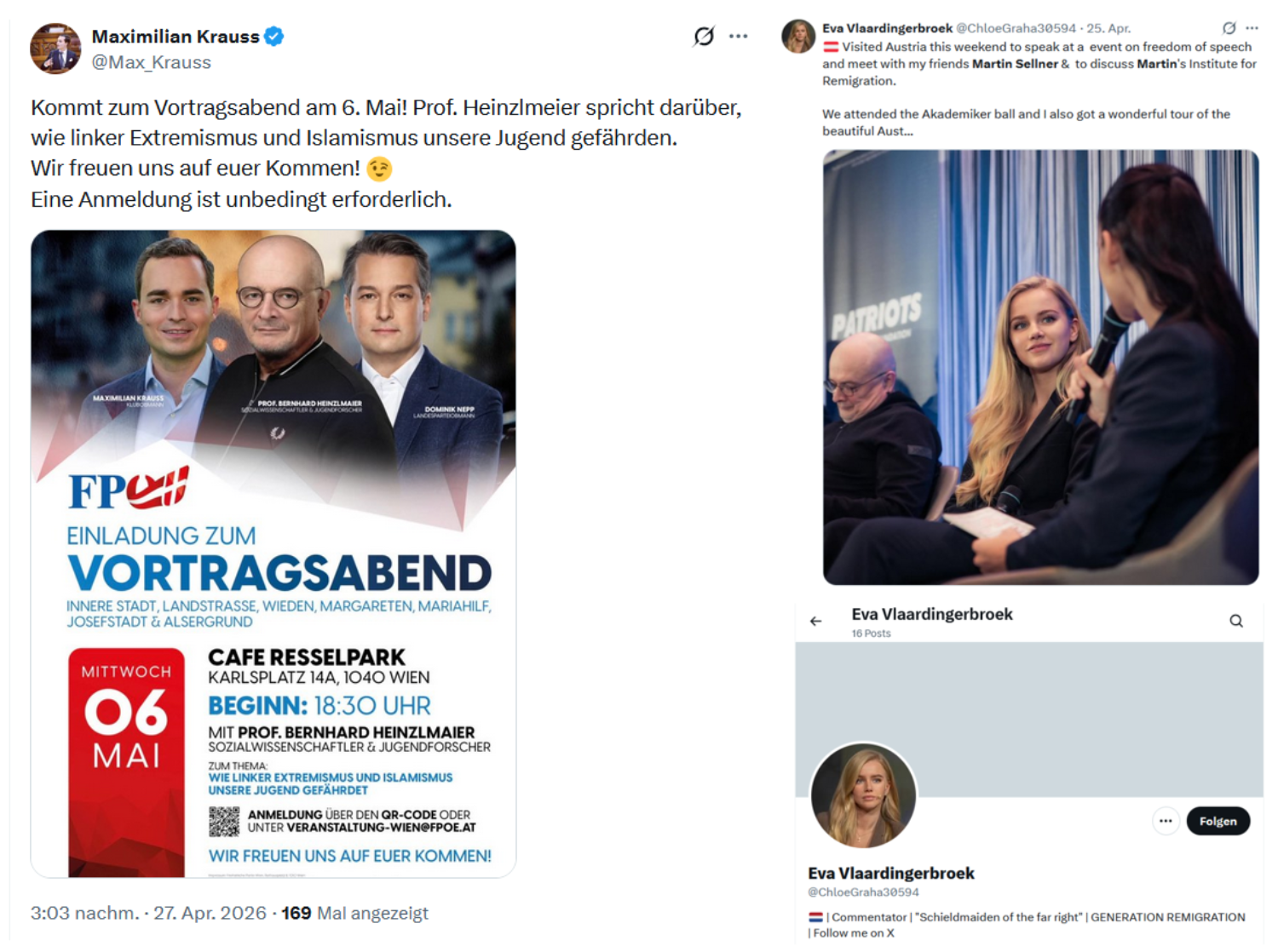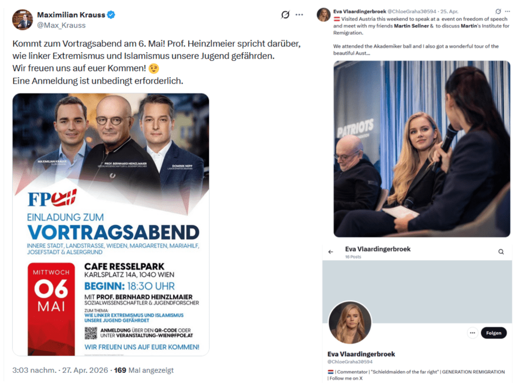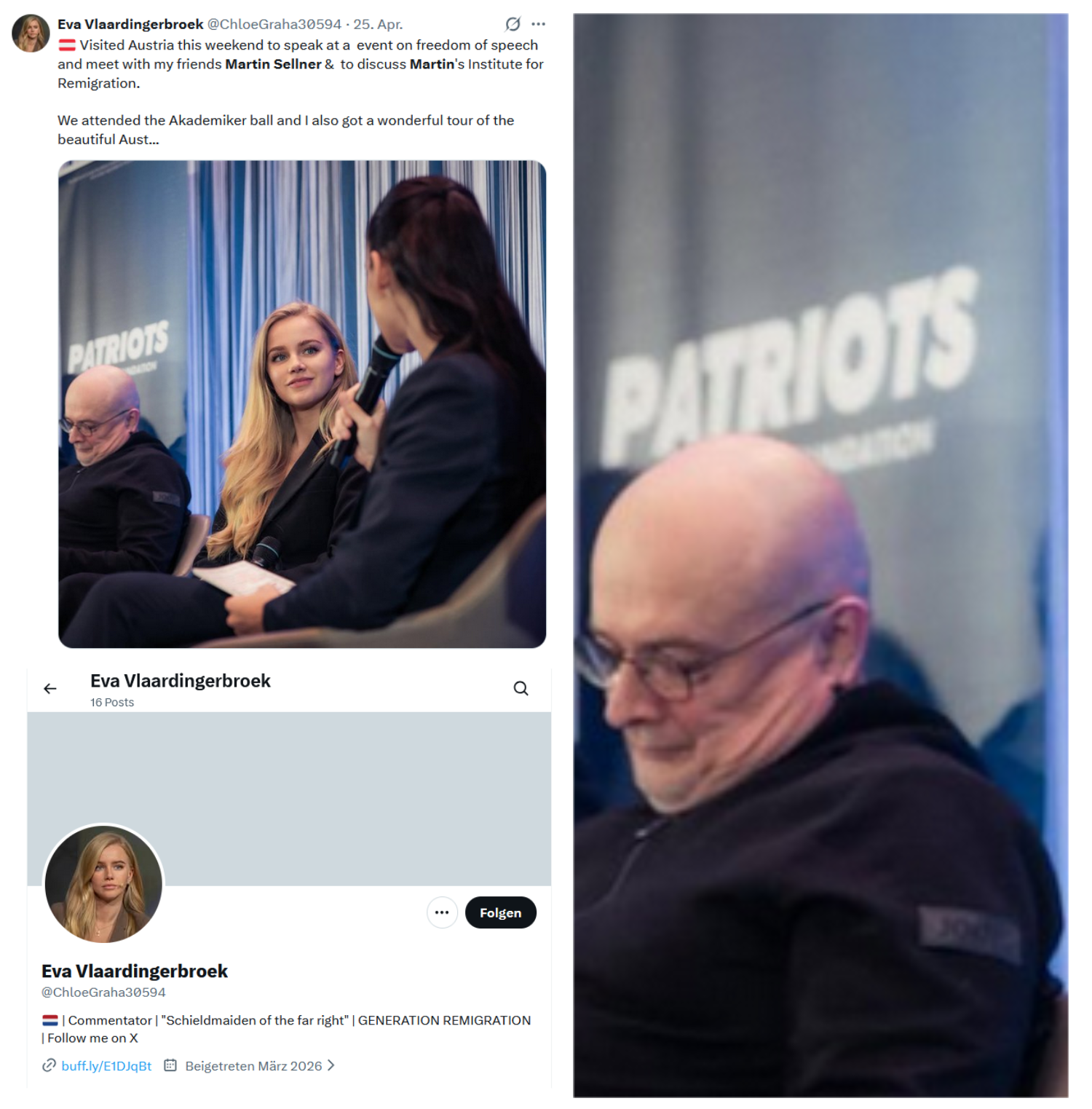Eva Vlaardingerbroek, „Schildmaiden of the far right“ (Kriegerin der extremen Rechten) hat auf der Konzernplattform am 25. April 2026 einen Schnappschuß zu ihrer Schilderung von einem Wochenende in Österreich gesandt, der ein derart gehaltvoller Schnappschuß ist — nahezu zur ewigen Aufbewahrung.