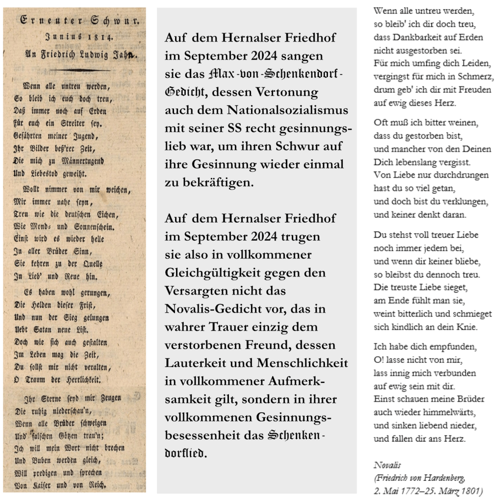 Aber sie haben nicht dieses Lied der Treue von Novalis gesungen, um einen ihnen lieben verstorbenen Menschen der Lauterkeit und Menschlichkeit zu beweinen, sondern das von Max von Schenkendorf, der das Gedicht von Novalis mißbrauchte, für seinen „erneuerte[n] Schwur, Junius 1814, an Friedrich Ludwig Jahn“, jedoch ebenfalls nicht aus Anlaß seines Todes, denn Jahn starb 1852 …