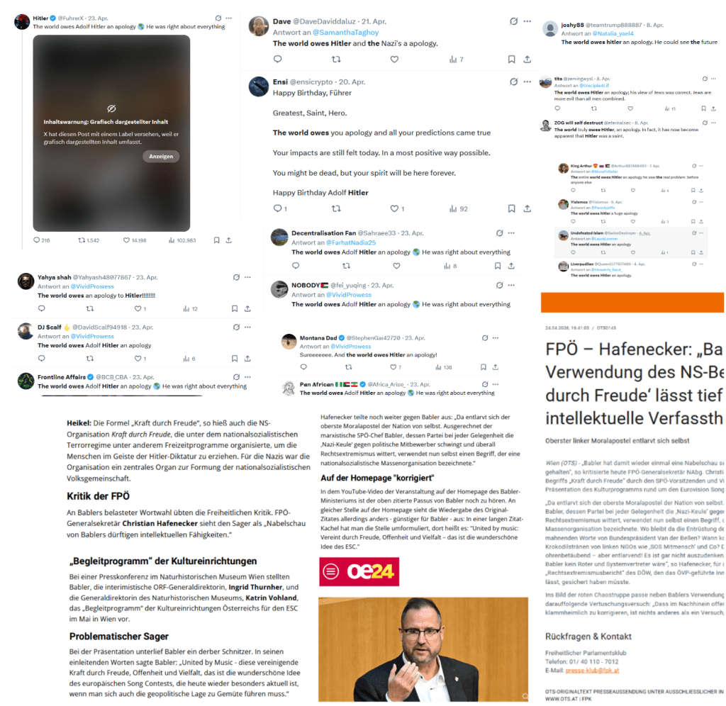 Seit zwölf Stunden ist auf dieser Konzernplattform ein Posting öffentlich zur Verbreitung, seit zwölf Stunden an diesem 23. April 2026, das nicht zitierbar ist, der Inhalt dieses Postings ist kein Inhalt, sondern ein Unhalt, a non-content, und dennoch haben bereits 10.381 Personen innerhalb von zwölf Stunden diesen Unhalt mit einem „Herz“ gekennzeichnet, und dennoch haben 1.089 Personen innerhalb von zwölf Stunden diesen Unhalt geteilt. Das Posting ist von einer Person, die sich den Namen eines Österreichers gegeben hat, und von dem nun in diesem Posting vom 23. April 2026 behauptet wird, er hätte in allem Recht gehabt, die Welt schulde ihm eine Entschuldigung.
