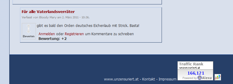 Wirft ebenfalls die Frage auf, ist es für das Ansehen des Landes Österreich förderlich, einen III. Präsidenten NR zu haben, mit einer Kommentarstaffel, die regelmäßig auf Unzensuriert blutrünstige Phantasien veröffentlichen kann, ohne daß, wie es den Anschein hat, Dr. Martin Graf oder ein anderer der Abgeordneten NR, die als Autoren von Unzensuriert angegeben sind, diese Verherrlicher und Verherrlicherinnen von Gewalt und Mord je persönlich kontaktiert zu haben, um diese wenigstens zu ersuchen, ihre apolitischen Meinungen in einer entbrutalisierten Sprache zu äußern.