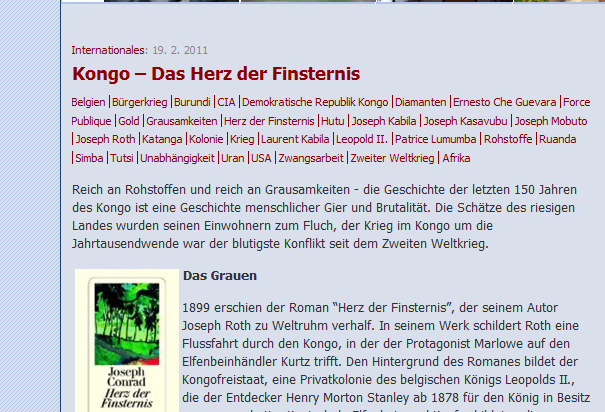 In diesem Beitrag über den Kongo wird als Autor von „Herz der Finsternis“ Joseph Roth genannt, gleich daneben aber das Umschlagbild mit dem tatsächlichen Autor Joseph Conrad veröffentlicht. Es reicht bei Dr. Martin Graf also nicht einmal, einen Namen richtig abzuschreiben. Aber seine Wähler und Wählerinnen im Parlament befanden, Dr. Martin Graf sei tauglich für eines der höchsten Staatsämter.