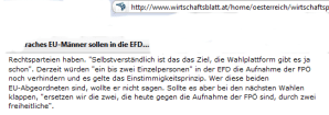 Der derzeitige freiheitliche Obmann will also nicht die EFD-Fraktion durch die Aufnahme von zwei weiteren Abgeordneten stärken, um diese im EU-Parlament stimmgewichtiger zu machen, sondern den unpolitischen Trieb befriedigen, sich, um nicht vom großen Wort der Rache zu sprechen, zu revanchieren für die erfahrene und wohl begründete Ablehnung der Aufnahme der Freiheitlichen in die EFD. Diese Aussage des freiheitlichen Obmannes sagt, wieder einmal, alles, was sogar jene, mit denen Freiheitliche in einer Fraktion sein wollen, von Freiheitlichen zu erwarten haben, das Klima der Drohungen, ersetzt zu werden, wenn nicht …