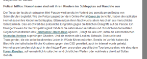 Es sind ja auch keine neuen Erkenntnisse notwendig, es sind ja auch keine gesellschaftlichen Veränderungen notwendig, alles, was die Seele zu tun hat, sagen ihr ohnehin die Angestellten der Organisierten Glauben, die aktuell wohl mit Sehnsucht aber auch Stolz ob der Umsetzung ihrer Predigten die Berichte über die CSD-Veranstaltung in Split lesen und ihre liebevollen Fäuste zum Dankensgebet gen Himmel strecken, weil die Straße in Split derart voll mit Geist ihres Geistes gefüllt ward, die Kinder sogar dazu mitgenommen, sie zu lehren und sie praktisch zu unterweisen, wie in Schritten gegen den Anderen vorzugehen ist. Zu den ersten Tritten gehört bereits auch die Drohung: