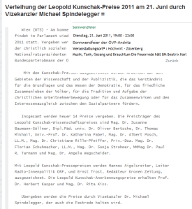 Am 21. Juni 2011 werden, doch wieder, Leopold-Kunschak-Preise vergeben werden. Michael Spindelegger wird die Preise übergeben, die Rede halten. Im Parlament. Es durfte für kurze Zeit angenommen werden, es werden wenigstens in diesem Jahr keine Leopold-Kunschak-Preise im Parlament Werbung für einen Antisemiten …