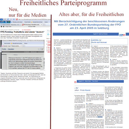 „Sprache, Geschichte und Kultur Österreichs sind deutsch“ steht von der Gesinnung her auch im Programm, das 2005 …, halt nur, oh Anforderung an das Lesenkönnen, verteilt auf mehrere Sätze, noch dazu auf längere Sätze, die auch noch in mehreren Kapiteln zu erbuchstabieren sind …