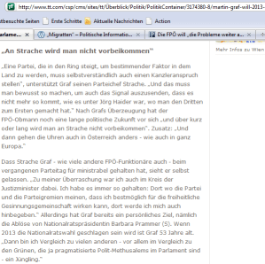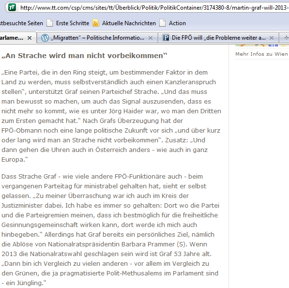 Und Dr. Martin Graf nennt dabei zugleich sein persönliches Ziel, er möchte 2013 I. Präsident NR werden … Wie könnte das erreicht werden? Dieses Ziel erreichte nicht Dr. Martin Graf persönlich, sondern andere trügen ihn auf dem Verhandlungstisch über den Einlauf … Stimmkräftige Unterstützung also der ÖVP, capsche Großzügigkeit der freien Stimmentscheidung für sozialdemokratische Abgeordnete machte … Bei Wählerinnen und Wähler außerhalb des Parlamentes, zumindest bei jenen, die an den beiden Umfragen sich bisher beteiligten, findet Dr. Martin Graf nach wie vor nicht annähernd eine Mehrheit, nicht einmal für sein zurzeitiges Amt …