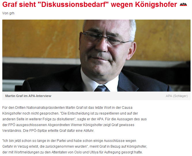 Wie wäre es Werner Königshofer ergangen, wäre Werner Königshofer der III. Präsident NR gewesen? Hätte Norbert Hofer ebenso reagiert, dieses präsentable Amt für die Freiheitlichen aufgegeben? Die Antwort darauf gibt Dr. Martin Graf selbst in der Tiroler Tageszeitung vom 7. August 2011: