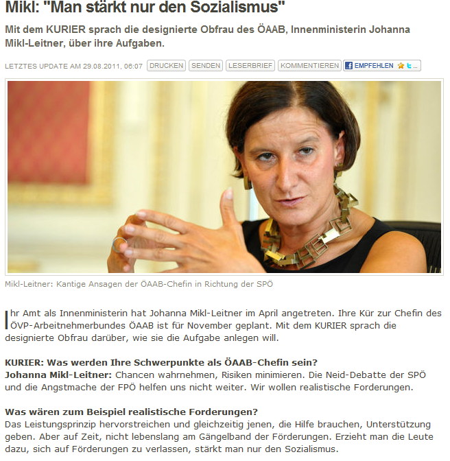 Das Programm von Johanna Mikl-Leitner als designierte ÖAAB-Obfrau gemäß ihren Aussagen im Interview vom 28. August 2011 kann durchaus auf den Nenner gebracht werden: Für Arbeiterinnen und Angestellte zu arbeiten, wird meine Sache nicht …