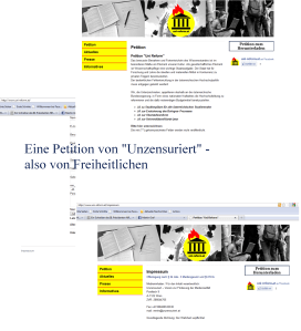 Es ist damit aber nicht gemeint, eine Petition der Freiheitlichen dürfe nicht unterstützt werden, sondern lediglich, es sollte offen dargestellt werden, wessen Petition unterstützt zu werden gewünscht wird, und nicht erst nach langer Recherche selbst herausfinden zu müssen, zuerst über das Impressum, daß es doch nicht beispielsweise eine Petition von unibrennt ist, sondern von Unzensuriert … Und dann muß zusätzlich noch herausgefunden werden,, wer die Macher sind von Unzensuriert … Es kann nicht erwartet werden, daß sofort gewußt wird, daß es eine freiheitliche …