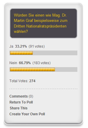 Möglicherweise würden die 274 Menschen als Abgeordnete ebenso diese zwei Gesetze, mit denen „Sicherheit“ verkauft werden will, mit einer Zwei-Drittel-Mehrheit ablehnen, wie sie in dieser Umfrage sich mit 66,79% dagegen aussprechen, einen wie Mag. Dr. Martin Graf zum dritten Nationalratspräsidenten zu wählen.