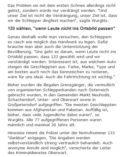 Bemerkenswerter als die tollpatschige Formulierung über Menschen, die nicht ins Ortsbild passen würden, ist an diesem polizeilichen Aufruf aus dem Burgenland, das amtliche Verbreiten von Gerüchten (da gestützt auf nichts anderes als Vermutungen, als wäre die Polizei eine Sektion von sozial-heimatlichen Parteien), daß nämlich noch heuer Tausende …