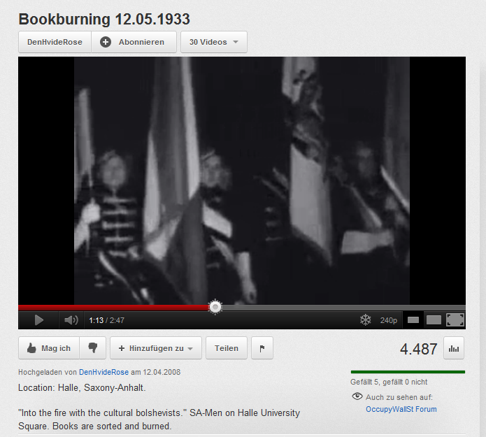 NS Der Film, der die Schaften fesch in Uniform beim Bücherverbrennen zeigt, ist aus Halle, und das erinnert nicht nur daran, daß Schafter sich im nationalistisch kriminellsten Deutschland von 1933 bis 1945 ebenfalls hervorgetan haben, sondern auch an die Reise des III. Präsidenten NR in 2010, die ihn von der Germania Halle in das Haus der Burschenschaft Rheinfranken in Marburg führte … Es müßte die größtmöglich denkbare Polemik eingesetzt werden, auch als Eingeständnis der Ideenlosigkeit, es anders als mit Polemik noch beschreiben zu können, welche Geschichte etwa von der Burschenschaft Rheinfranken verbreitet wird, es ist eine Geschichte, die im Grunde nur die Deutschen als Opfer kennt, Jahr für Jahr, auch in ihrer Totengedenkveranstaltung vom 17. Juni 2011, Jahr für Jahr wird an der Geschichte des unschuldigen, aber pflichterfüllenden deutschen Soldaten …