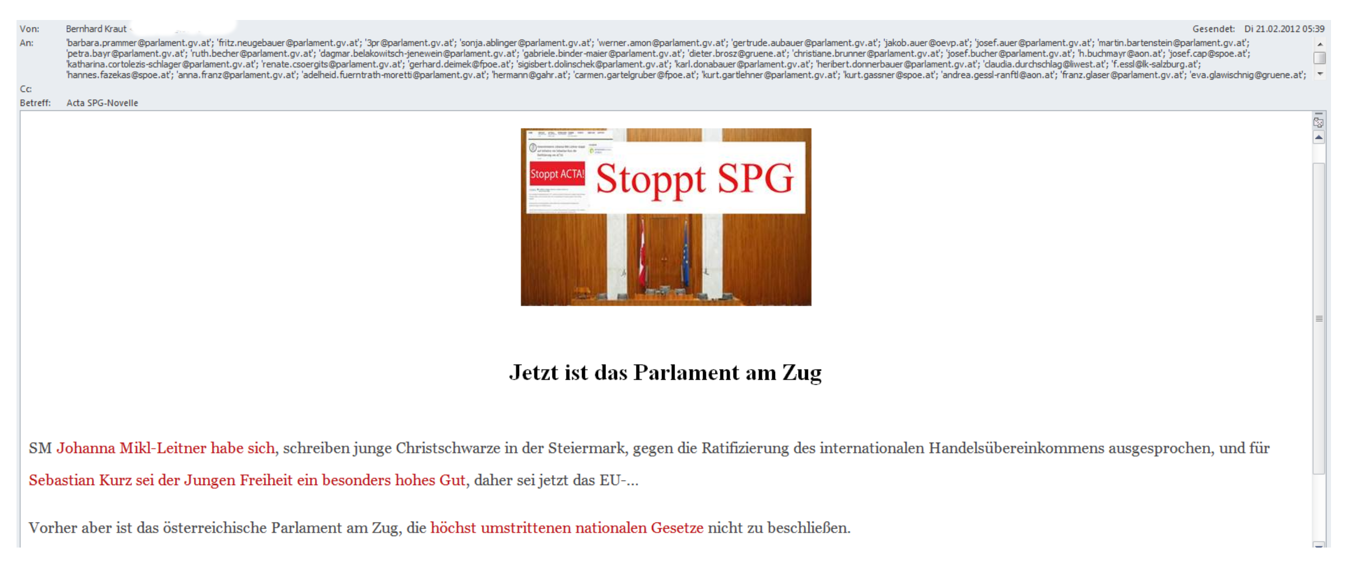 Das gestrige Schreiben an die Abgeordneten des österreichischenn Parlaments hatte zur Folge, daß bisher zwei Abgeordnete antworteten, aber nicht zur SPG-Novelle, sondern ausschließlich zu dem Handelsübereinkommen ACTA, obgleich, so war die Meinung, der Betreff, die Montage und die Verlinkungen es mehr als deutlich machen, daß es um die nationalen Gesetze aus dem sogenannten Anti-Terror-Paket geht …