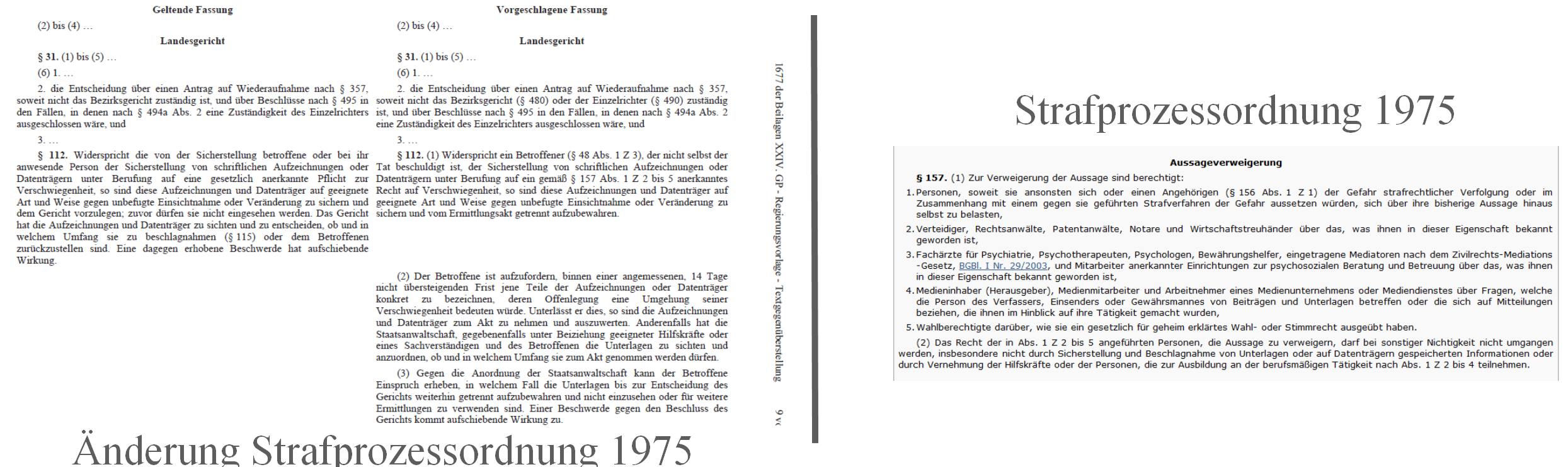 In der beabsichtigten Änderung des Paragraphen 112 wird zwar auf auf den Paragraphen 157 Abs. 1 Z 2 bis 5 verwiesen, der in der geltenden Strafprozeßordnung 1975 das Recht auf Verschwiegenheit regelt, aber in der gesamten vorgeschlagenen Fassung ist keine Änderung respektive Anpassung des Paragraphen 157 Abs. 2 zu finden, und auch kein Hinweis in den Erläuterungen zur vorgeschlagenen Fassung.