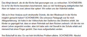In diesem Interview in sechs Tageszeitungen schiebt Christoph Schönborn die „schwarze Pädagogik“ dem Staat zu, in diesem Fall dem österreichischen Staat, und die sechs Tageszeitungen apportieren gehorsam die „Botschaft“ des leitenden Angestellten, es sei absolut nicht ein kirchliches Problem alleine gewesen … Und ach, Christoph Schönborn als Schüler habe den „Sadismus des Direktors“ erlebt … Und ein Direktor repräsentiert den Staat, und sonst …