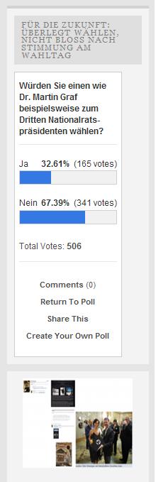 … nach wie vor würde eine überwältigende Mehrheit, nämlich gute zwei Drittel wollen Dr. Martin Graf nicht wählen. Seit der letzten Bekanntgabe des Zwischenstandes sind es wieder ein wenig mehr geworden, die sich gegen eine Wahl von Dr. Martin Graf aussprechen: von 67,25% auf 67,39% …