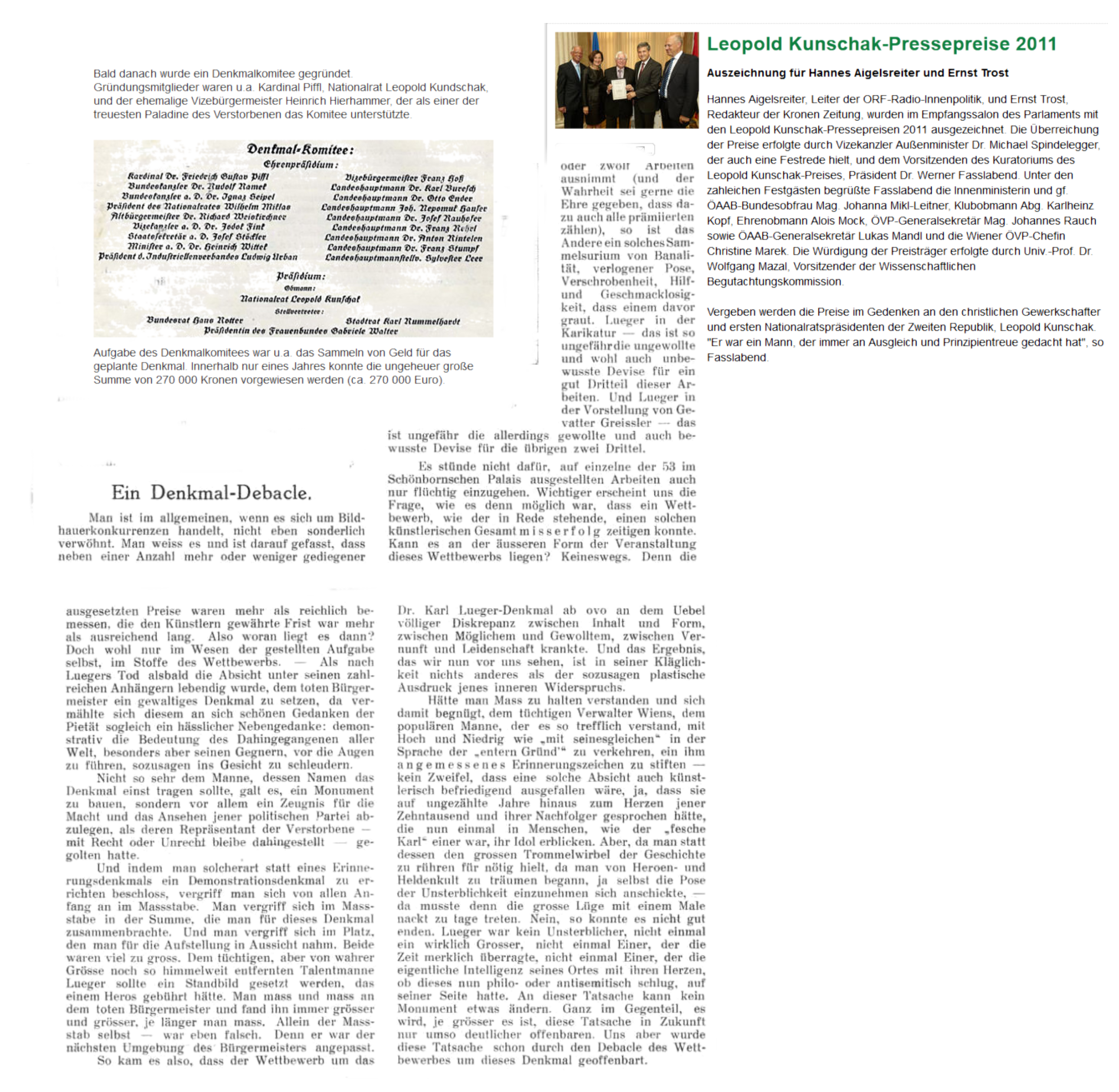 PS Karl Lueger wird nun, der, um ihm seinen Ring zu erhalten, zu einem ganz großen Bürgermeister hochgeschrieben wird … Karl Lueger wurde aber vor 100 Jahren realistischer beurteilt, wie in der „Wiener Bauindustrie-Zeitung“ in der Ausgabe Nr. 11 von 1913 zu lesen war, unter der Schlagzeile „Ein Denkmal-Debacle“, auch darüber, warum Denkmäler errichtet werden: