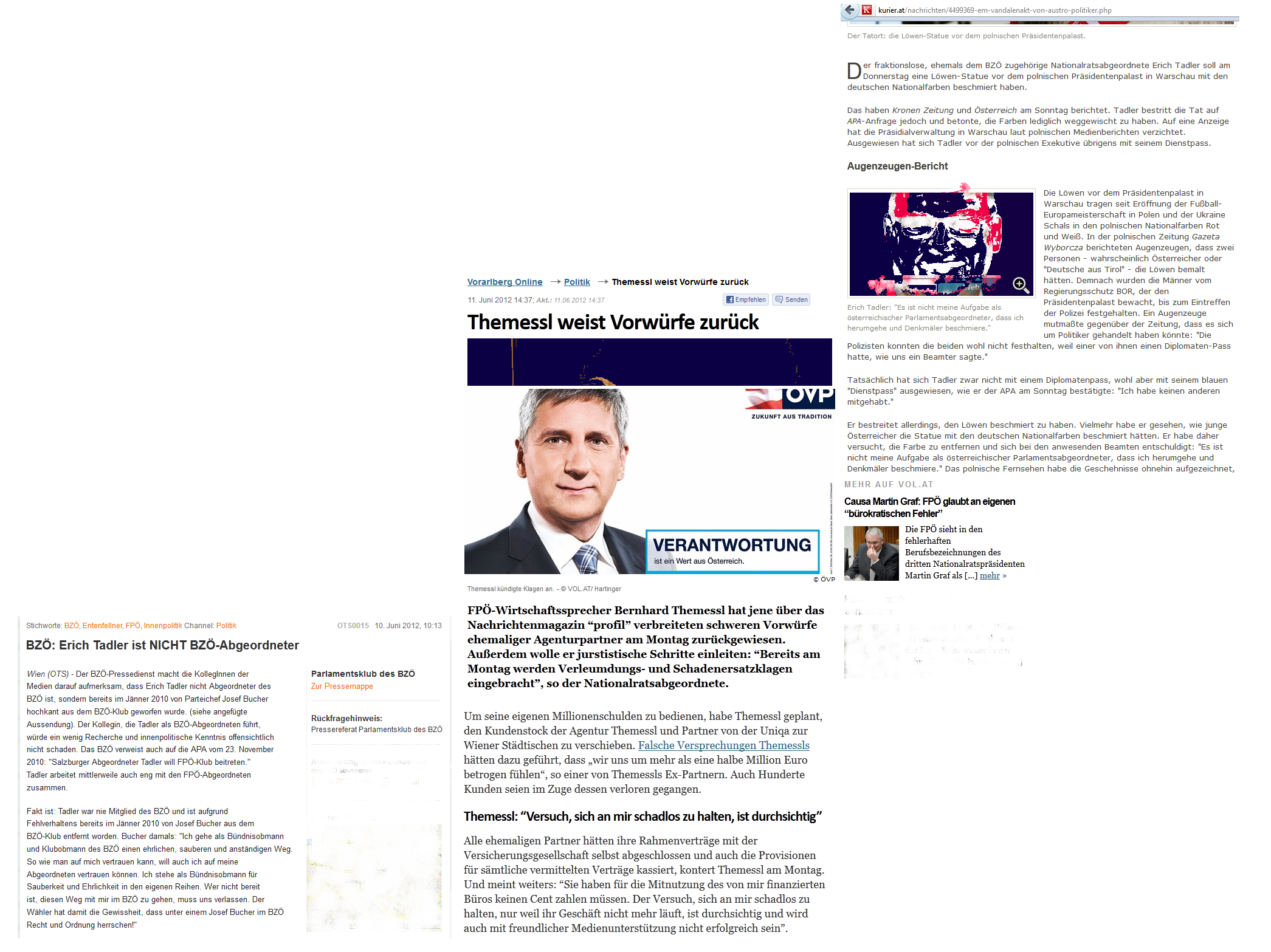 Auf Schlagzeilen sitzt dieser Tage, weder positive noch negative aber wenigstens nur erheiternde, noch ein Abgeordneter aus diesem Lager, der zuerst ein blauer, dann ein blaßblauer war und jetzt ein sogenannter wilder Abgeordneter ist, der inzwischen, wie in der Collage auch gelesen werden kann, wieder eng mit den blauen Abgeordneten zusammenarbeiten soll -, was eine durchaus stimmige Zusammenarbeit und eine stimmige blaue Heimkehr wäre, wenn es sich herausstellen sollte, daß er, Erich Tadler, tatsächlich in Polen den Löwen mit den deutschen Nationalfarben beschmiert haben sollte … Erich Tadler wisse, wird er zitiert, was nicht seine Aufgabe als Abgeordneter sei, nämlich Denkmäler zu beschmieren, sondern seine Aufgabe sei, darf daraus geschlossen werden, als Abgeordneter Denkmäler von Farben zu reinigen -, ob damit bereits seine Aufgabenbeschreibung für seinen Arbeitsplatz Parlament erschöpfend …