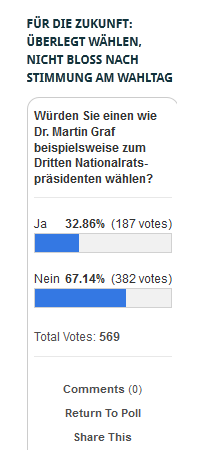 Aus der Fragestellung dieser Umfrage geht aber klar hervor, daß es weit über Dr. Martin Graf hinausgeht, er im Grunde lediglich ein Beispiel ist, es um die eigentliche Frage geht, ob weiter dieser Typus von einem Politiker, von einer Politikerin gewählt werden soll, wählbar ist, für den Dr. Martin Graf beispielhaft steht … Solange der Wähler und die Wählerin diesen Typus in jedweder Wahl mit ihren Stimmen legitimieren, wird es auch zu keiner Änderung der Usancen im Parlament kommen, werden die Abgeordneten ebenfalls diesen Typus wählen, zum Beispiel einen wie Dr. Martin Graf etwa zum Dritten Nationalratspräsidenten …