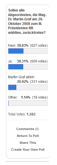 Vor drei Jahren, am 18. Juni 2009, wurde diese Umfrage gestartet, ob Martin Graf allein oder alle im österreichischen Parlament, die ihn zu ihrem III. Präsidenten NR machten, zurücktreten sollen …