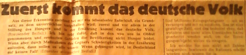 Zuerst kommt das deutsche Volk – Wenn aber durch Maßnahmen des Gegners Schwierigkeiten in der Ernährung auftreten, dann sollen es alle wissen: Wenn gehungert wird, in Deutschland auf keinen Fall! (Erneuter stürmischer Beifall.)