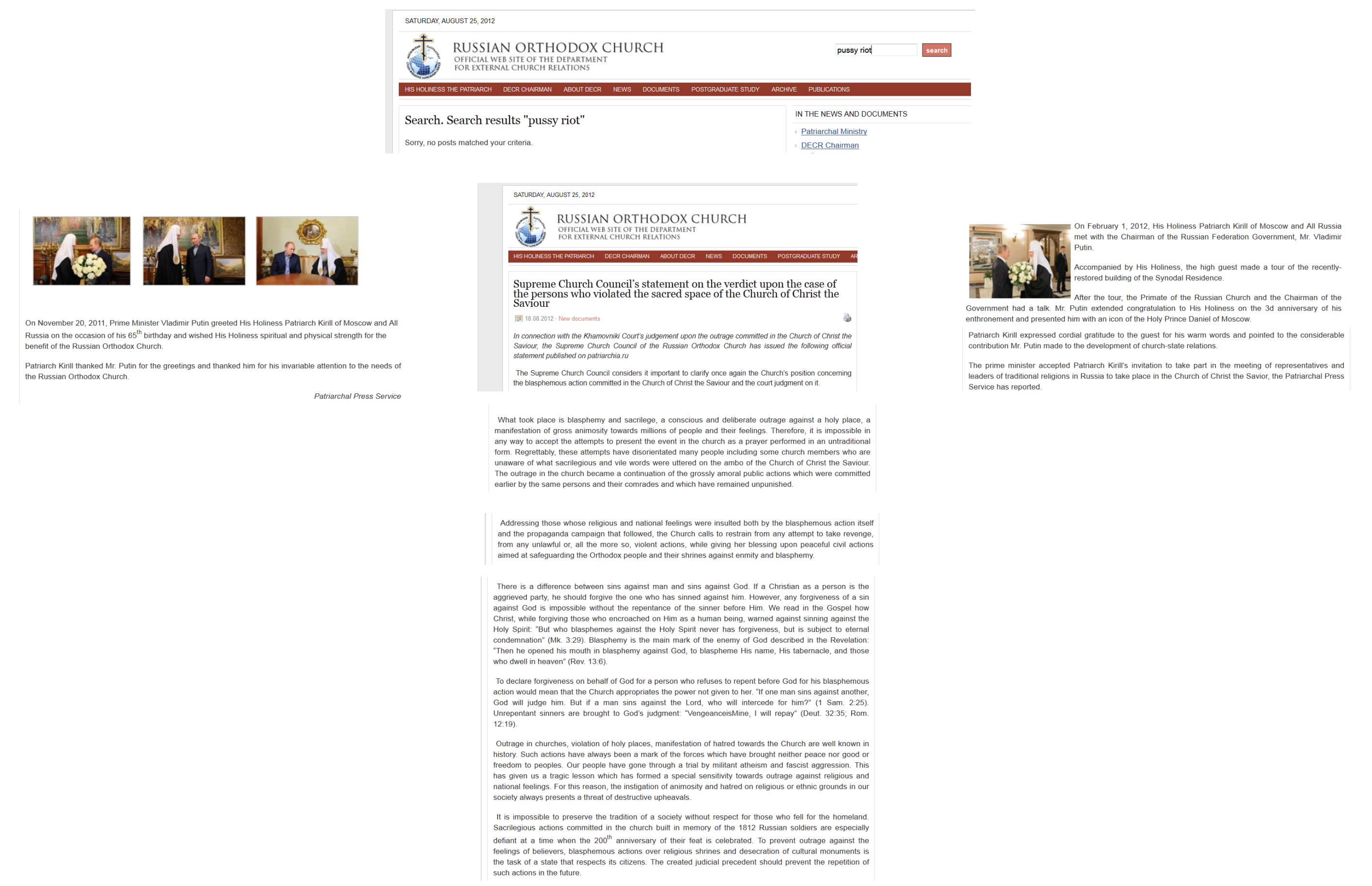 Es stellt sich die Frage, welches Wort zu schreiben scheuen Angestellte dieses Organisierten Glaubens mehr: „Pussy“ oder „Riot“? Eines aber ist gewiß, sie schrecken davor zurück, „Pussy riot“ zu schreiben, sogar dann, wenn sie einen Tag nach der Verurteilung von „Pussy riot“ einen Artikel darüber veröffentlichen … Sie schaffen es, „Pussy riot“ zu Namenlosen zu machen, und was es heißt, vor allem in letzter Konsequenz, zu Namenlosen gemacht zu werden, das muß nicht besonders ausgeführt werden …