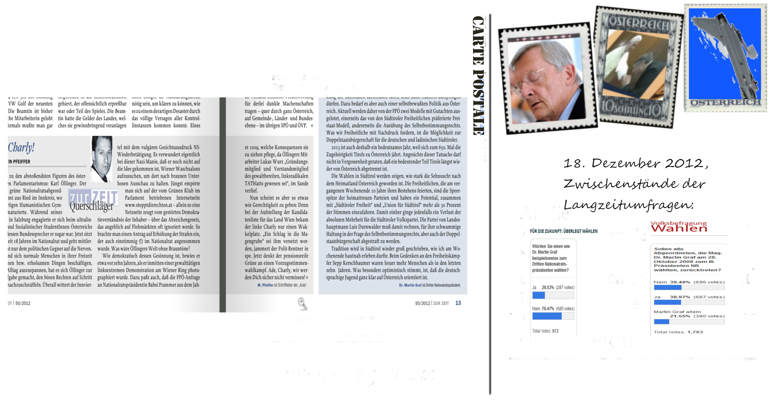 Der III. Präsident NR schreibt einen, um ein heute geläufigeres Wort zu nehmen, Terroristen nicht nur hoch zu einem „Freiheitskämpfer“, sondern Martin Graf reist an einem Dezember-Wochenende des Jahres 2012 auch nach Südtirol, um an dem Gedenken für Sepp Kerschbaumer teilzunehmen … Sepp Kerschbaumer ist also für den freiheitlichen III. Präsidenten NR eine Reise wert -, ob bei diesem Gedenken auch sein deutsches Bekenntnis verlesen wurde?
