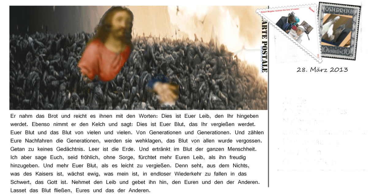Last supper is the opening supper Veröffentlicht April 2, 2013 in 3614 × 1926 in Wessen Leiber hinzugeben, wessen Blut zu vergießen ← Zurück