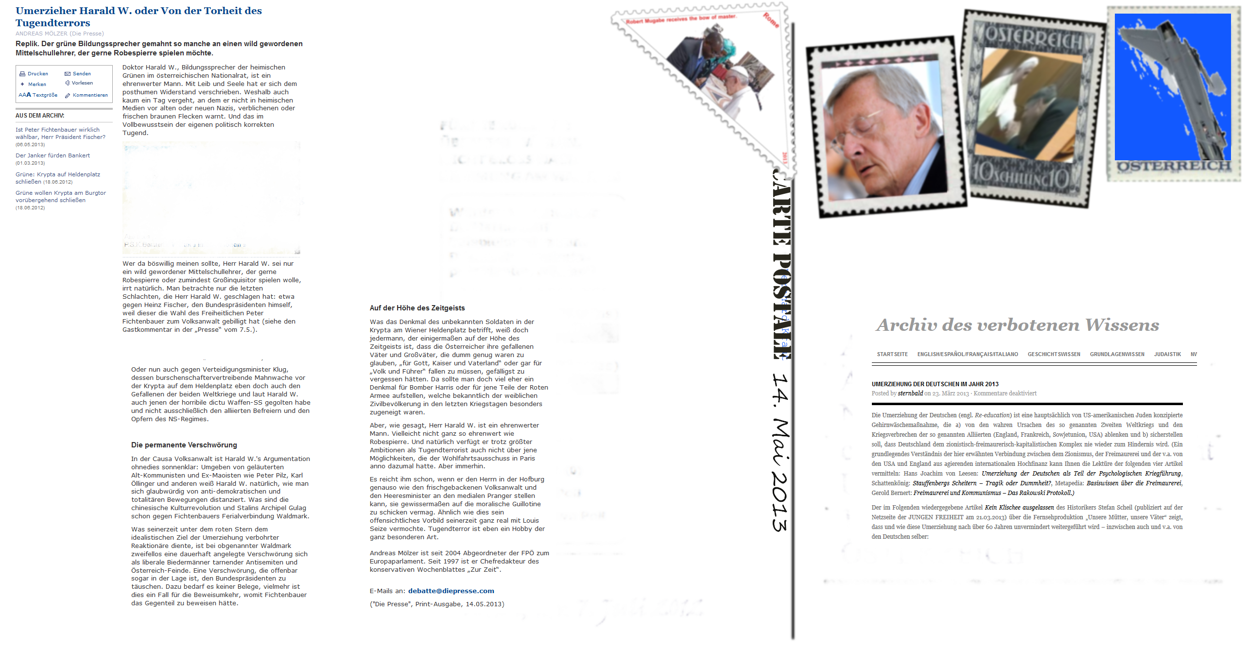 Was auch gewußt wird, ist, daß Andreas Mölzer Harald Walser, sogar dadurch, daß er Harald Walser lächerlich machen wollte, bestätigt … Bereits mit dem Wort „Umerzieher“ in dem von der Tageszeitung „Die Presse“ veröffentlichten Titel. „Umerziehung“ ist ein Wort, das heute in den Lagern verwendet wird, von denen sich Freiheitliche wieder und wieder und wieder mit Distanzierungen zu betätigen haben … Ein Beispiel dafür, wie und von wem das Wort „Umerziehung“ heute noch gebraucht wird, wurde zur Projektion von Andreas Mölzer auf die carte postale geklebt … „Die Presse“ läßt Andreas Mölzer in seiner Umkehrung, Verdrehung auch dem freiheitlichen Volksanwalt Peter Fichtenbauer beistehen – von dem ebenfalls gewußt wird …