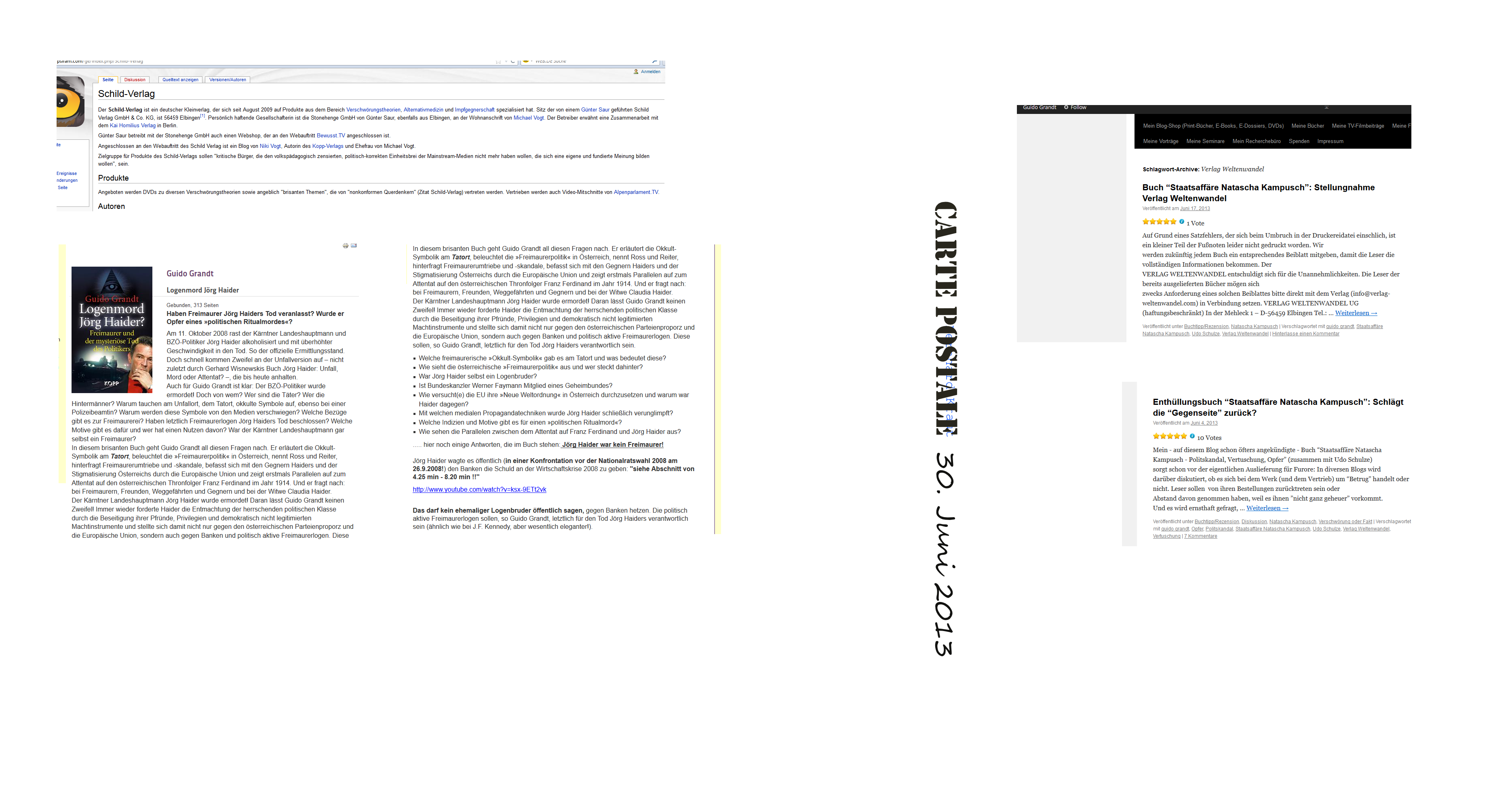Es wird besonders hervogehoben, daß hier unabhängiger, unzensierter Journalismus betrieben wird. Nun. Michael Vogt interviewt Guido Grandt und Udo Schulze über ihr Buch beim Verlag Weltenwandel, dessen Geschäftsführer Günter Saur ist, mit dem Michael Vogt Geschäftsbeziehungen unterhält. Informationen hierzu ebenfalls auf die carte postale geklebt. Im Grunde aber reicht das Ansehen dieses Interviews vollkommen, um zu wissen, daß dieses Buch ein Aberwitz ist, ein „Scharlatanerieprodukt“, um ein Wort über andere Produkte aus diesem Umfeld zu verwenden. Daß schlampig gearbeitet wurde (Satzfehler beim Umbruch der Druckereidatei), schreibt Guido Grandt selbst in seinem Blog vom 17. Juni 2013, am 4. Juni 2013 muß er sich damit auseinandersetzen, ob Werk und Vertrieb ein „Betrug“ …