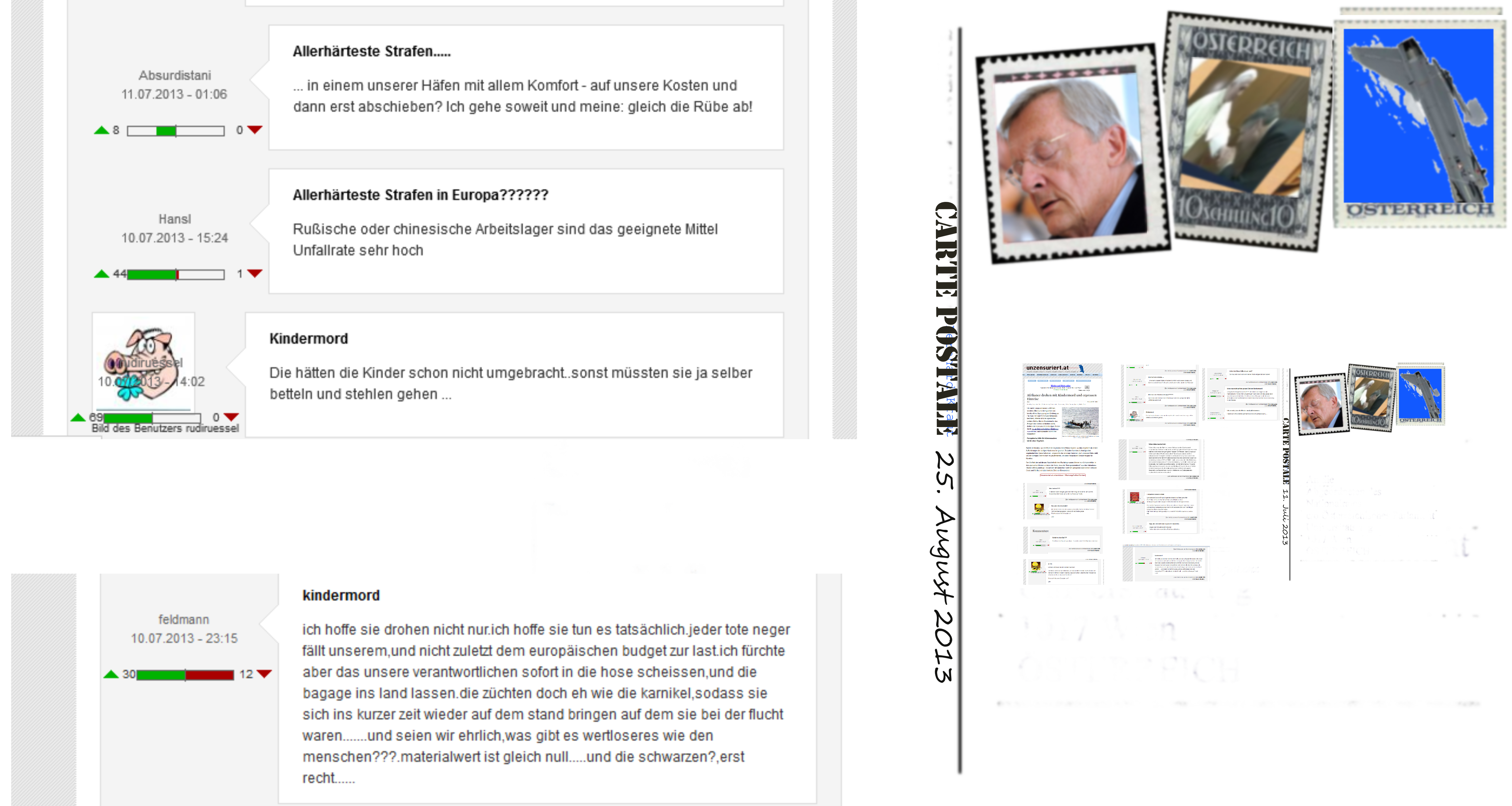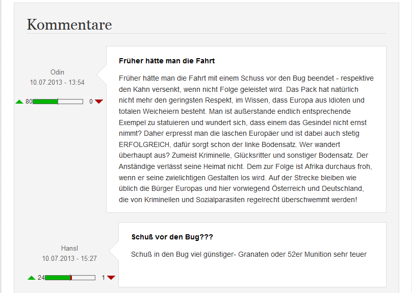 Aber das ist nicht der Fall. Seit über einem Monat stehen die blutrünstigen „Lösungsvorschläge“ auf Unzensuriert.At und erfahren durch das Voten weitere und erschreckende Zustimmung, wie gelesen werden kann …