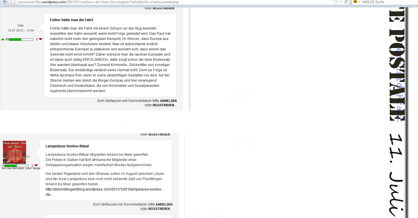 Die Website des noch amtierenden freiheitlichen III. Präsidenten NR, die Website mit freiheitlichen Abgeordneten als Autoren und Autorinnen, zu denen auch der mögliche nächste freiheitliche dritte Nationalratspräsident gehört, sofern Wähler und Wählerinnen wieder erfahrungsvergessen Freiheitliche zu einem nicht geringen und also dafür ausreichenden Prozentsatz am 29. September 2013 wählen werden – worauf sich dann wohl wieder vor allem die Christschwarzen im Parlament berufen werden -, müßte, könnte gedacht werden, besonders sorgfältig von ihren Betreibern und Betreiberinnen geprüft werden und also müßten beispielsweise Kommentare mit Mordphantasien rasch und von sich aus gelöscht werden, dürfte die Verantwortung dafür nicht auf Dritte abgeschoben werden, dürften nicht andere, wie es schon geschehen ist, dafür verantwortlich gemacht werden, wenn auf der freiheitlichen Site etwas nicht gelöscht wird …