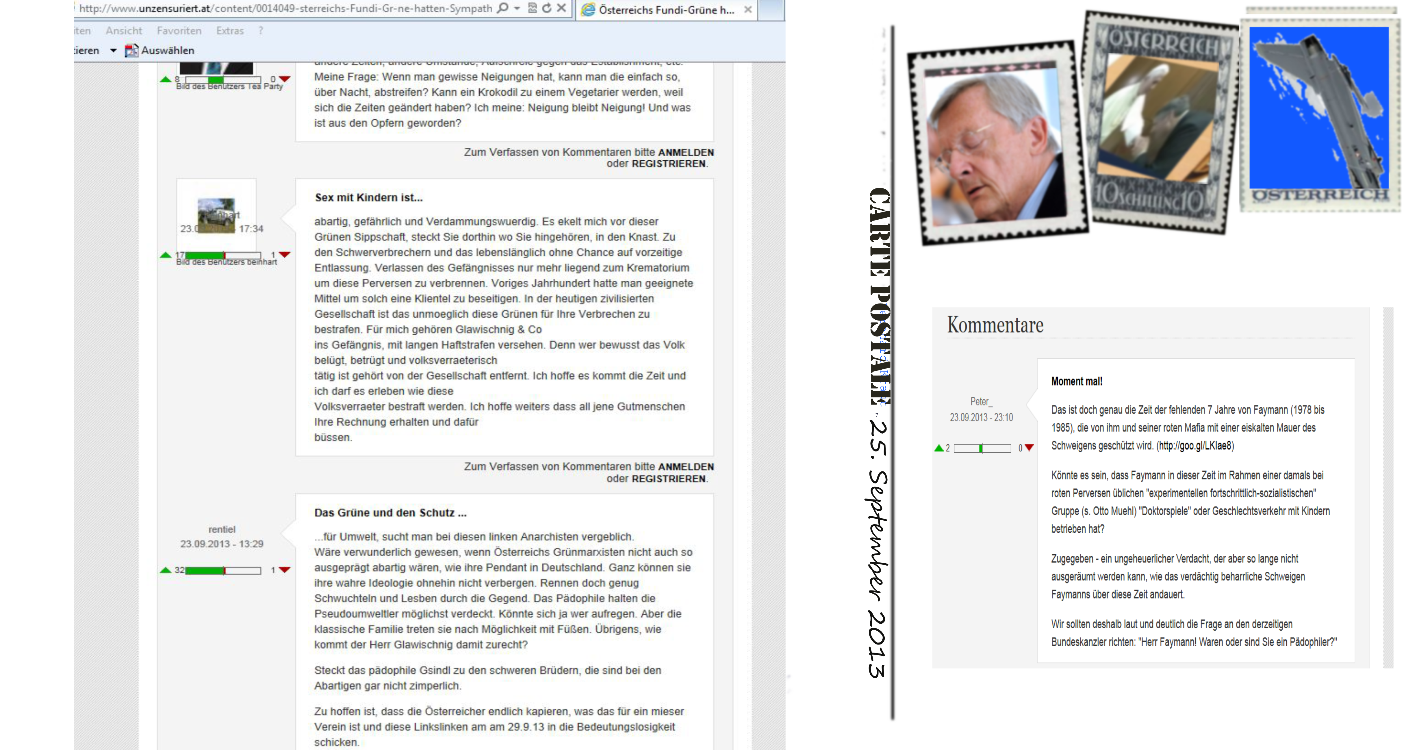 Und die skandalöse Ungeheuerlichkeit jetzt daran ist, daß diese neuerlichen Phantasien und Vorschläge zur Gesellschaftsgestaltung brutalster, rohester und unzivilisiertester Art seit zwei Tagen auf der freiheitlichen Website zu lesen sind, diese also nicht augenblicklich gelöscht worden sind. Denn es sind nicht diffus gegen irgendwen formulierte Verfolgungsforderungen blutrünstigster Art und schamloseste Verleumdungen und widerwärtigste Unterstellungen, sondern konkret gerichtete gegen Menschen, die nicht den Freiheitlichen angehören, also einer bestimmten anderen Partei, und infamste Unterstellung sogar direkt gegen einen einzelnen, nämlich gegen Bundeskanzler Werner Faymann … Das sind derart kriminelle Anschuldigungen, die nicht zitiert werden wollen, aber als Beweis mußten diese gegen den eigenen Willen auf die carte postale geklebt werden.