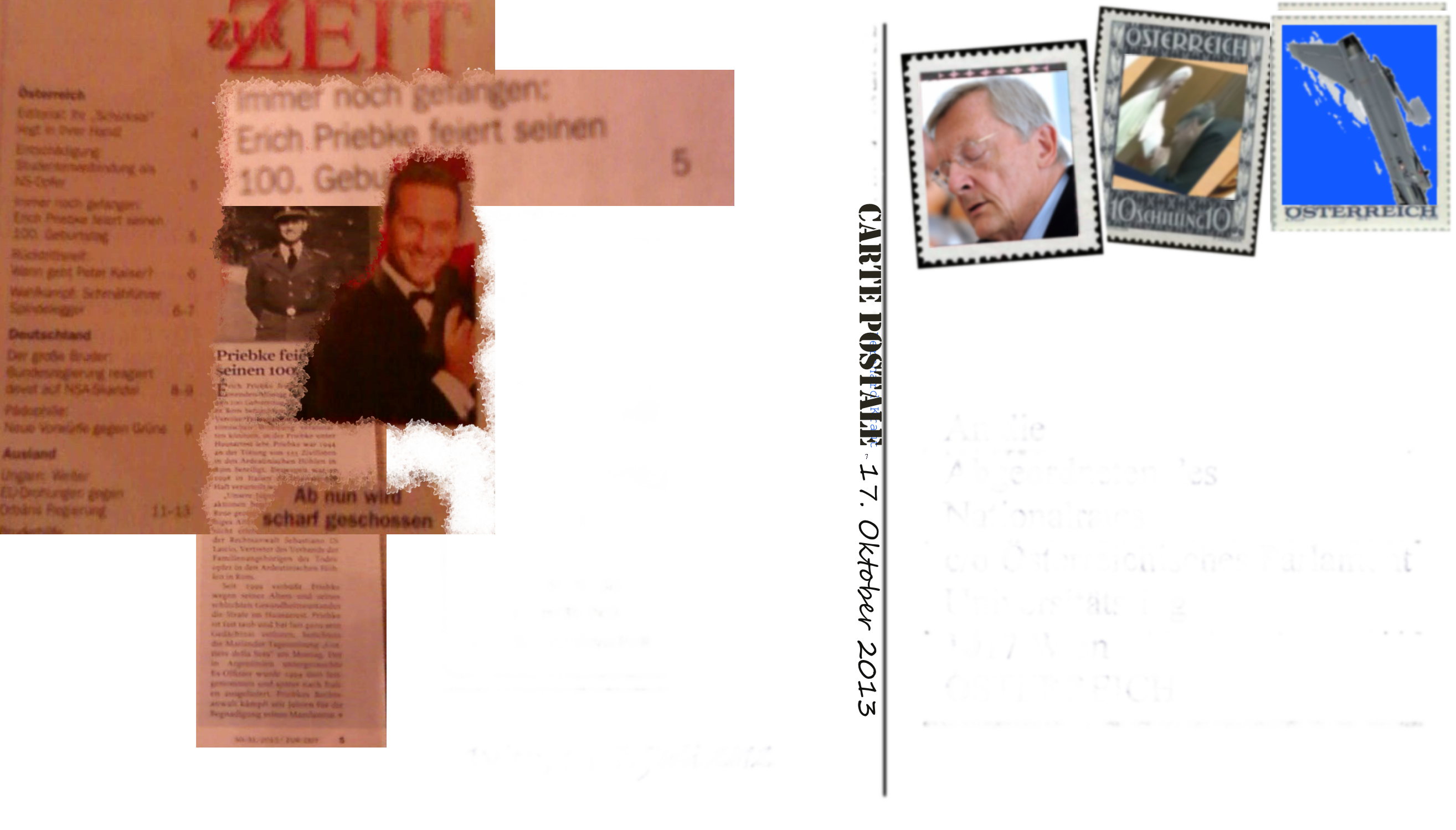 NS Es soll für eine Achtelsekunde angenommen werden, der tote Erich Priebke könne das absurde Theater um seine Bestattung beobachten … Ob er sich dabei wünschen würde, doch lieber in Österreich gestorben zu sein? … In Österreich, wo es noch werte Männer gibt, die ihm eine recht ordentliche Beerdigung … Wie es die Piusbruderschaft in Italien versuchte, und die ihre ihnen Zugetanenen auch in Österreich … Aber wer weiß, vielleicht ertönt noch der Ehrenruf aus Österreich, er solle heimgeführt werden in die treugroße deutsche Sprach- und Kulturerde …
