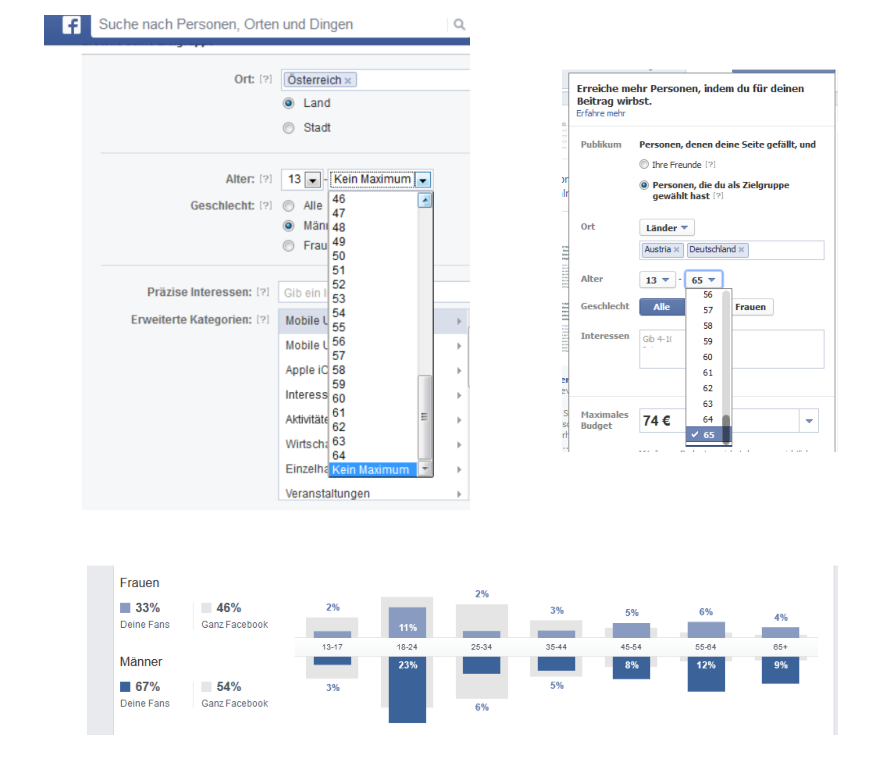 Dieser Gedanke kommt unweigerlich beim Formular des Unternehmens Facebook zum Ausfüllen einer Werbeanzeige … Das Unternehmen Facebook als das wohl verbreiteste Unternehmen im Social-Media-Bereich setzt diese Tabuisierung bereits um, das Alter höher als 65 darf nicht mehr vorkommen. Es bietet zwar noch die Möglichkeit bei einer nicht gänzlich automatisierten Werbeerstellung an, als Altersangabe „Kein Maximum“ anzuklicken, dafür aber ist bereit bei 64 Jahren Schluß. Beim Formular aber zum Bewerben einzelner Beiträge sind nur noch Menschen bis 65 Jahren als Zielgruppe auswählbar, alle, die also älter sind, sind für das Unternehmen Facebook einer Werbung nicht mehr wert, verbreitet somit dieses Unternehmen. Und bei der statistischen Auswertung sind Menschen ab 65 Jahren und mehr lediglich noch als eine Sammelgröße – es also nicht mehr von Interesse ist, wie viele „Fans“ zum Beispiel 70 Jahre oder 75 Jahre oder 85 Jahre sind … Der Einzelne ab 65 Jahren verkommt zum Vernachlässigbaren, zum Ausblendbaren, der als Massengröße gerade noch aufscheinen darf.