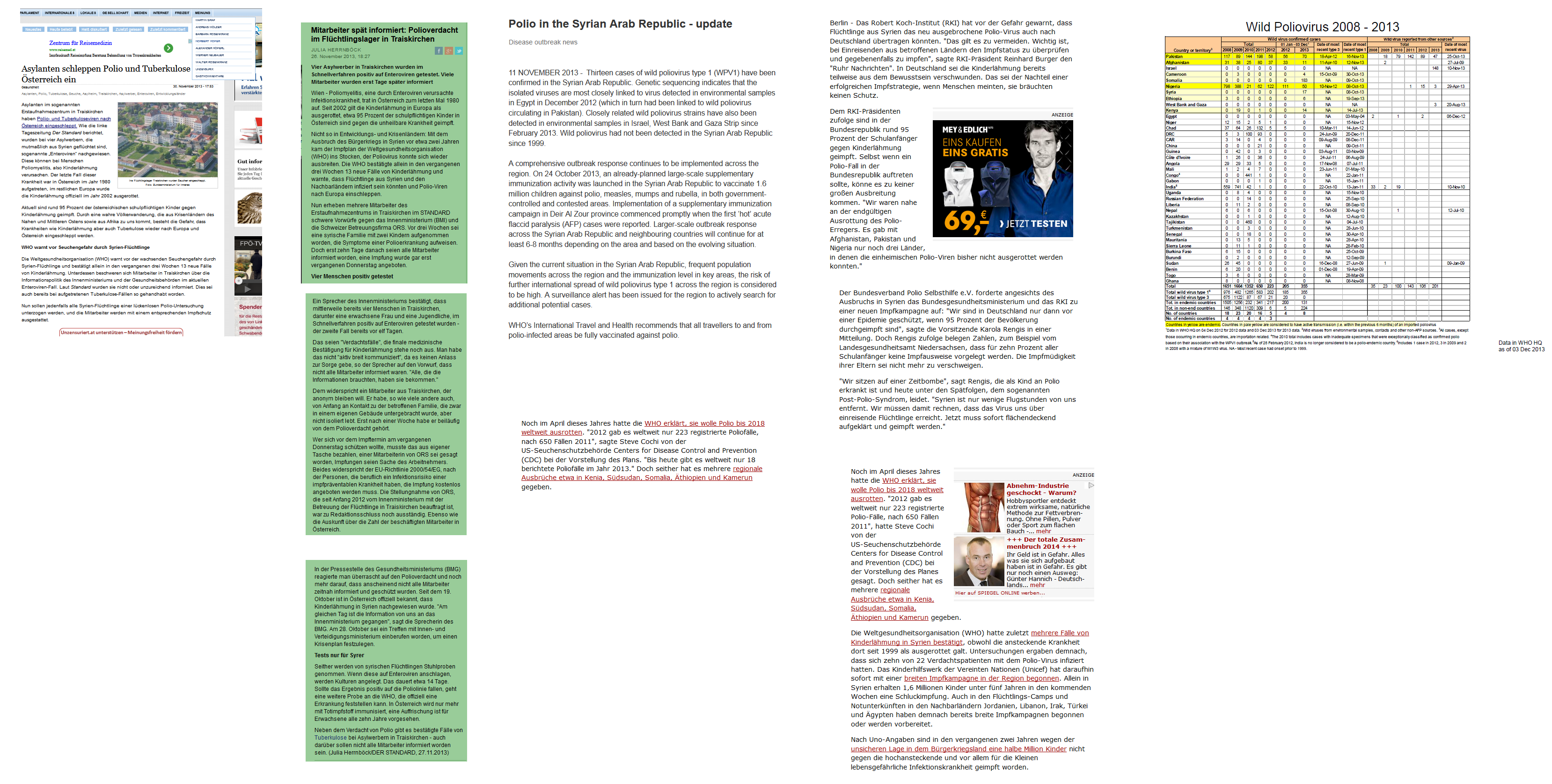 „Der Standard“ fand es nicht erwähnenswert, in seinem Bericht über das „Schnellverfahren“ zu erwähnen, daß beispielsweise allein in Syrien mit einer großen Impfkampagne sofort begonnen wurde, 1,6 Millionen Kinder eine Schluckimpfung erhalten. Obwohl „Der Standard“ mit seinem Artikel, in dem von 13 neuen Fällen berichtet wird, sich offensichtlich auf die Information von der WHO bezieht, in der auch von der breiten Impfaktion gesprochen wird.