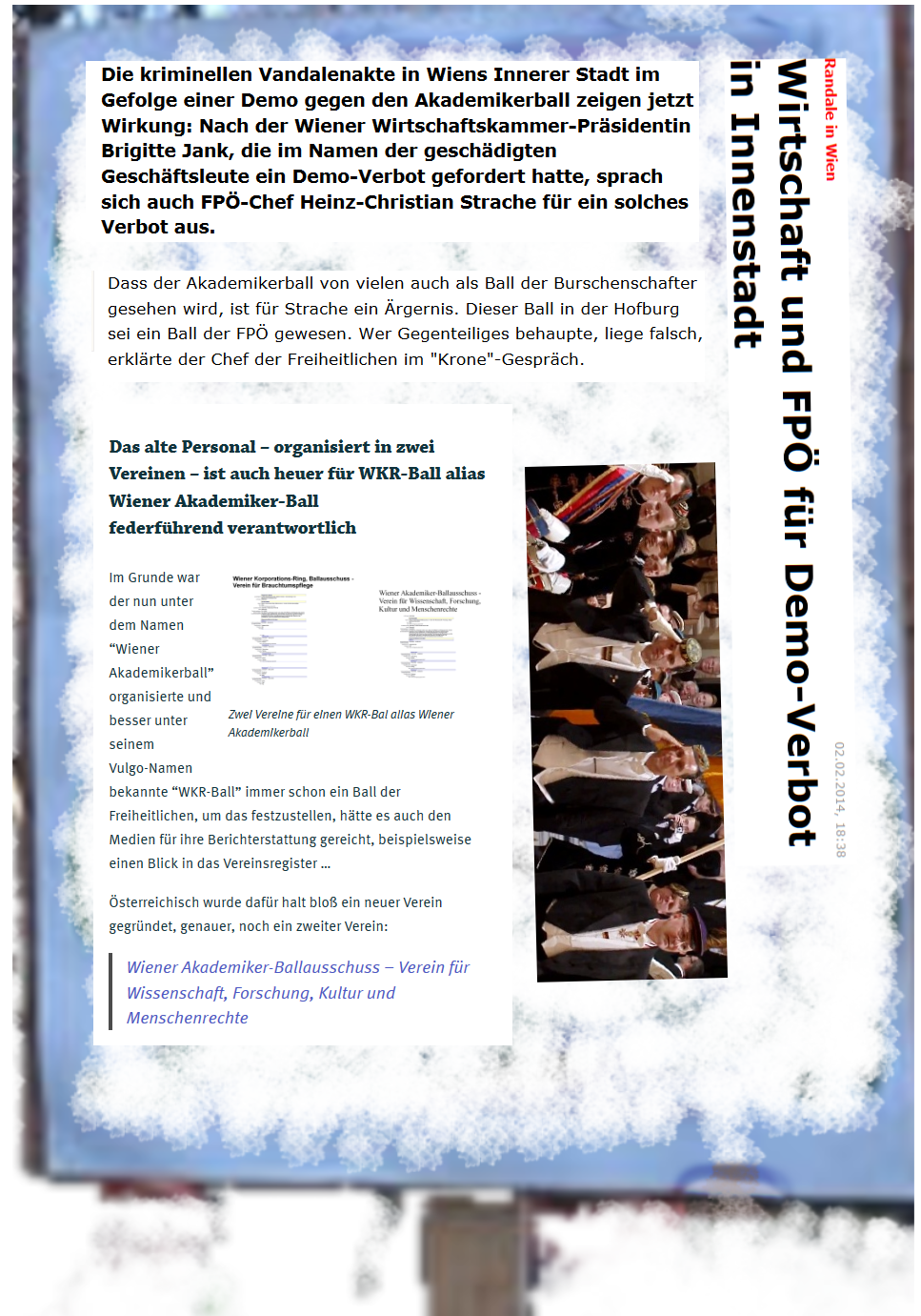 He.-Chr. Strache habe zwar gegenüber der Hauptvertreterin der gutter press in Österreich, also gegenüber der „Neuen Kronenzeitung“ gemeint, das Demonstrationsverbot würde dann auch für Burschenschaften gelten … Im Verschleiern ist die freiheitliche Gemein-Schaft gesinnungsgemäß ganz groß; He.-Chr. Strache weiß aber genau, die für Mai 2014 geplante Veranstaltung der Burschenschaften wird nicht „Demonstration“ genannt werden, und würde der Auftritt der Burschenschaften in der Innenstadt dann verboten werden, würde die freiheitliche Gemein-Schaft wieder nach Demokratie und Freiheit für sich brüllen, jammern, klagen, blärren und behaupten, es sei ja keine Demonstration, sondern ein „Fest der Freiheit“, die die Burschenschaften …