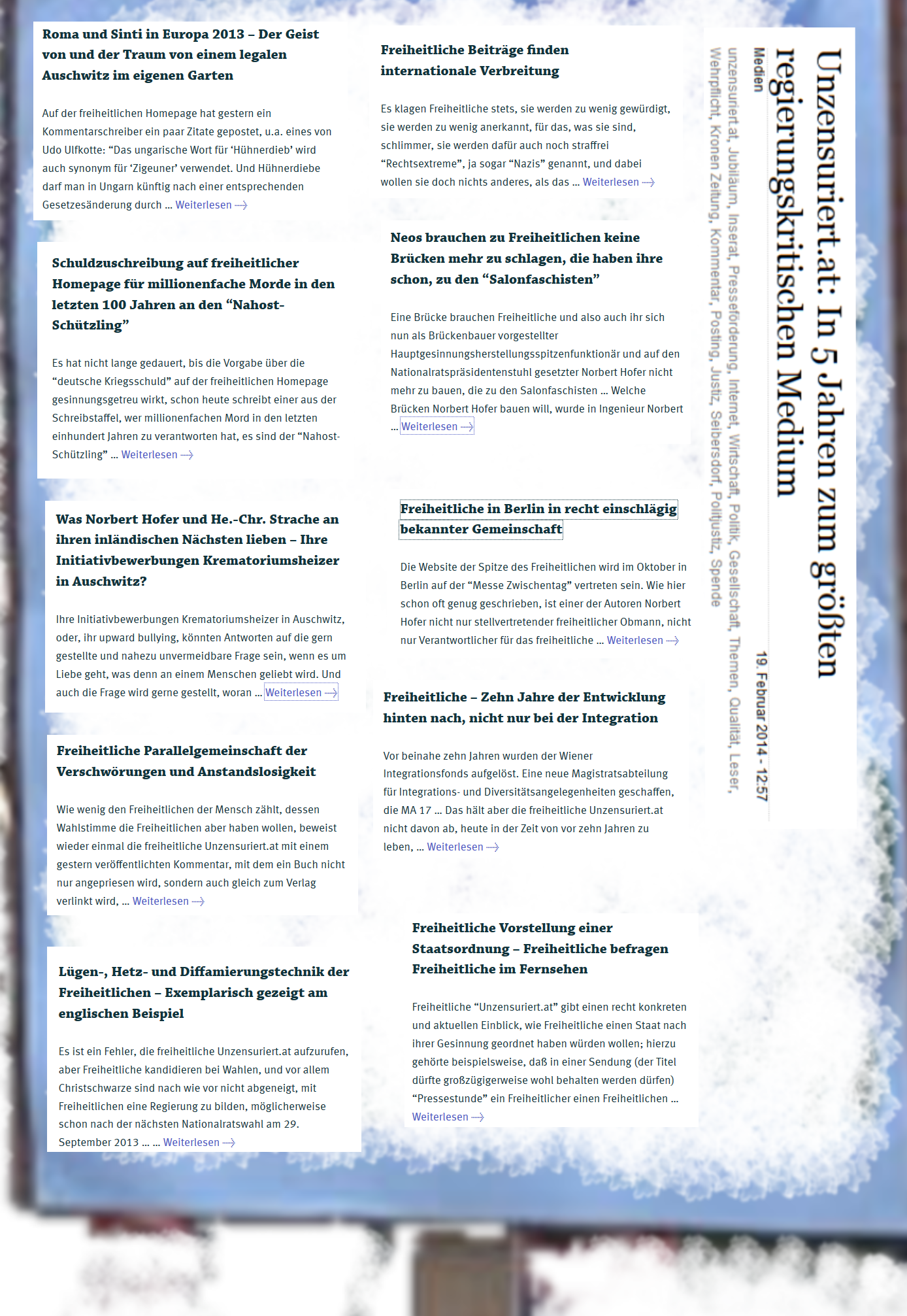 Unzensuriert nennt sich eine „Internet-Tageszeitung“ … Ihr Autor Ing. Norbert Hofer, III. Präsident NR, nennt sie schlicht: „Grafs Homepage“. Inzwischen wird Norbert Hofer nicht mehr als ihr Autor geführt. Hat er sich abgewendet? Oder ist er nicht so fleißig wie Andreas Mölzer, abseits der Funktion, für die er gewählt wurde? Oder ist es einfach und eher strategisch doch kein Renommee für einen dritten Nationalratspräsidenten, mit einer derartigen Homepage in Verbindung gebracht zu werden?
