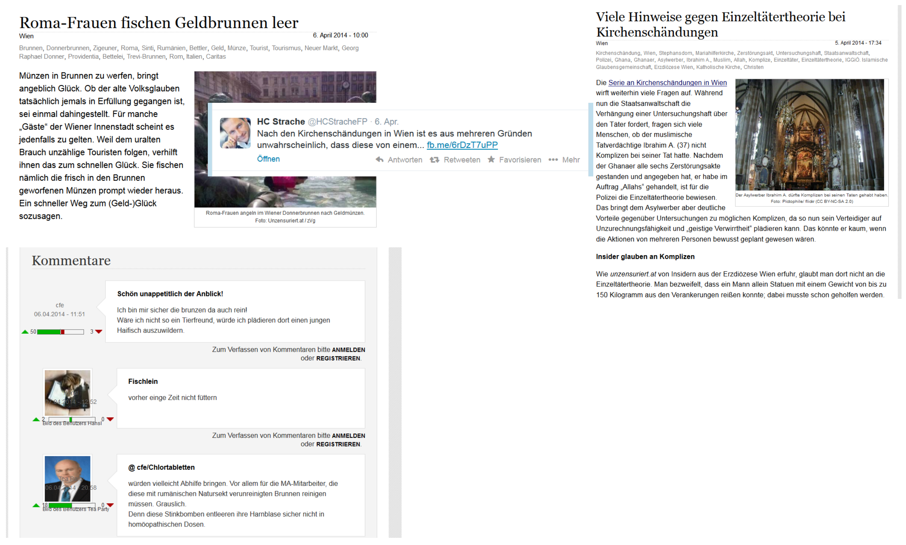 Und am Samstag, dem 5. April 2014, spekuliert die freiheitliche „Unzensuriert“ darüber, ob der Mensch denn die Statuen aus Gips und Holz ganz alleine konnte zerstören, er müsse doch „Komplizen“ … Menschen aus der freiheitlichen Gemein-Schaft wissen aus eigener Erfahrung nur recht gut, es gibt immer …, Wo beispielsweise ein Andreas Mölzer ist ein zweiter, ein dritter, ein vierter Andreas Mölzer mitten unter ihnen Harald Vilimsky … He-Chr. Strache aber läßt sich Zeit, er ist kein Mann der schnellen Schüsse, erst am Sonntag, vielleicht nach dem Kirchgang – ach, das Spekulieren wollte hier jenen überlassen werden, die das hypogut … Nun, am Sonntag kräht He.Chr. Strache auf der Plattform des Unternehmens Twitter, es sei aus mehreren Gründen unwahrscheinlich, daß die „Kirchenschändungen von einem“ und verlinkt zu dem Kommentar auf der freiheitlichen „Unzensuriert“, die schließlich jene Gründe anführen, die He.-Chr. Strache bestätigen, es sei – und es ward, wie es für Freiheitliche ist …