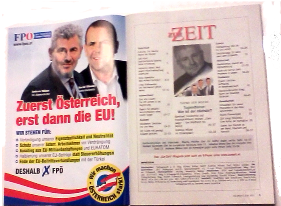 Heute, am 11. Apri 2014, in der Ausgabe der „Zur Zeit“, die heute, am 11. April 2014, erschienen ist. Nach der bloßen Aufgabe der Kandidatur von Andreas Mölzer, also nicht nach seinem Rücktritt als Abgeordneter. Alles, was dazu geschrieben werden könnte, schreibt diese freiheitliche Werbung für die EU-Wahl, weiterhin mit Andreas Mölzer, ohnehin selbst. Und was zum zweiten Mann in diesem Inserat, vor dem Andreas Mölzer prangt, geschrieben werden könnte, wurde erst gestern geschrieben, der ohnehin über sich selbst auch alles sagt, etwa dadurch, wen er in das Europaparlament gebracht haben will: