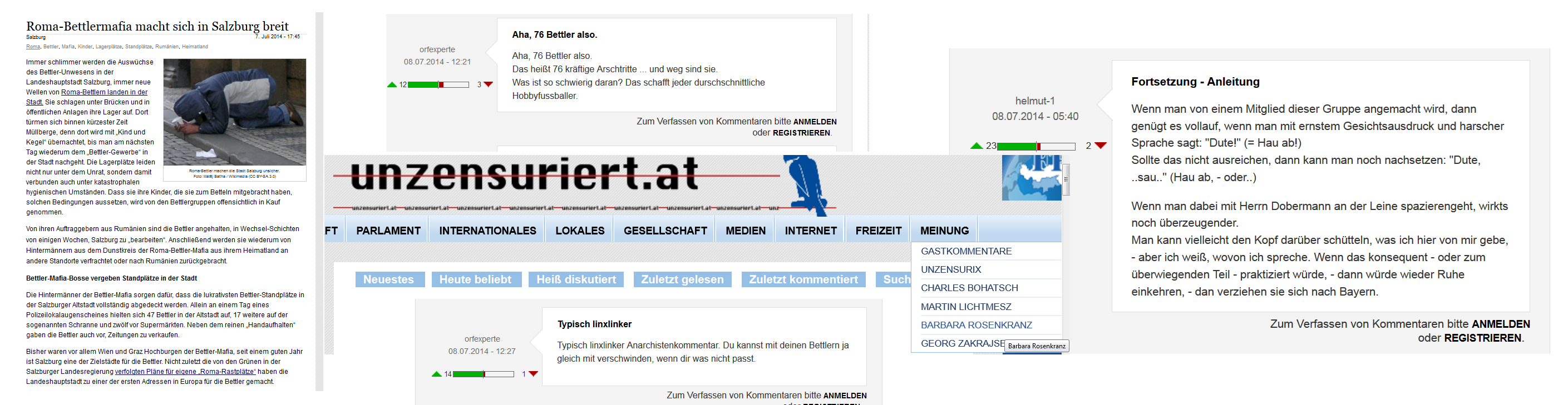 Es ist müßig, auf den Kommentar vom 7. Juli 2014 einzugehen. Es sind die bekannten Versatzstücke. Auch die Schreibstaffel der Unzensuriert übernimmt dabei wieder ihren mitläuferischen Teil, aber nicht nur mitläuferisch, wie der Collage entnommen werden kann … Dennoch darf nicht aufgehört werden, zu widersprechen.