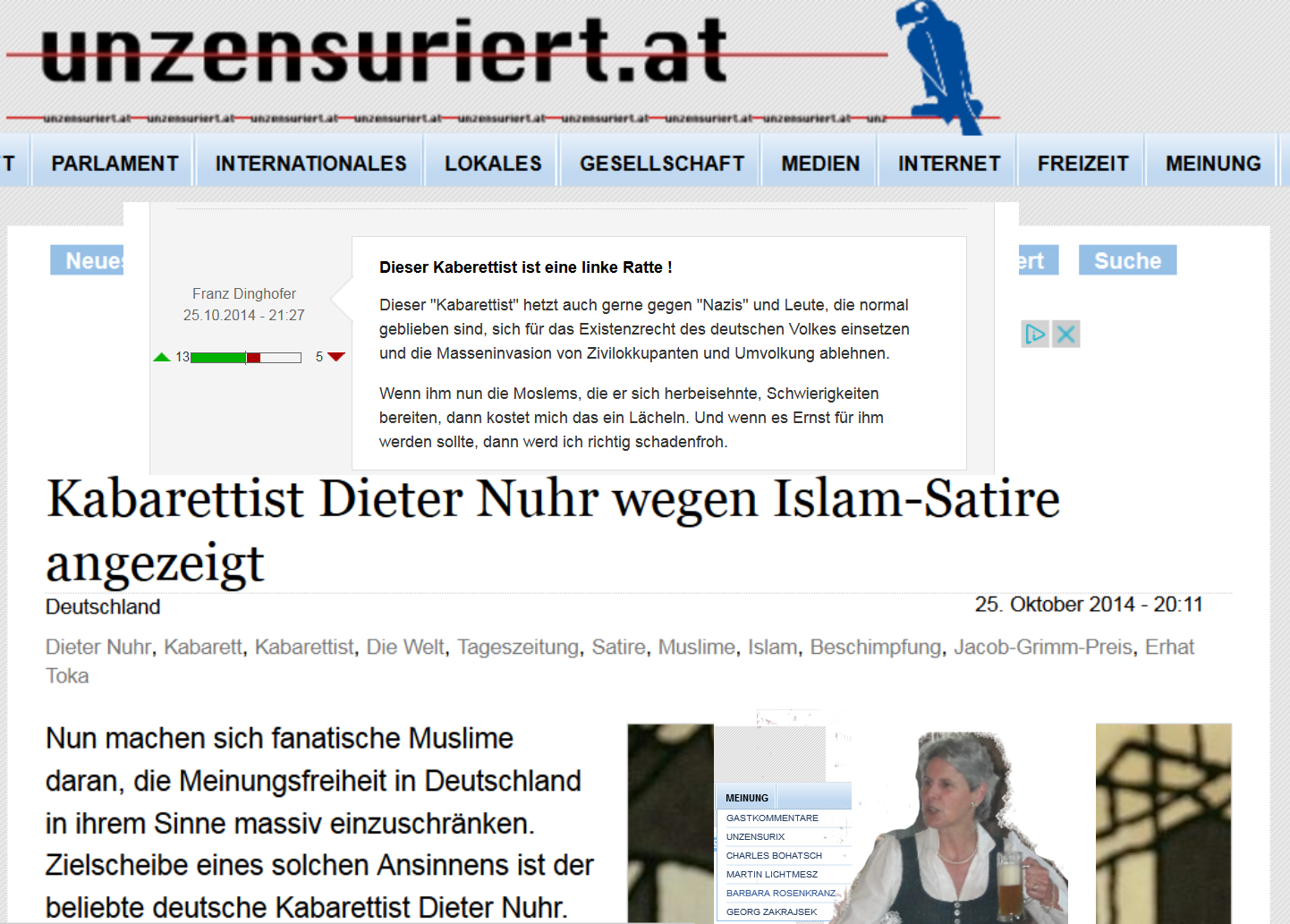 Sie könnten sagen, es geht hier ein weiteres Mal darum aufzuzeigen, welcher Gesinnung die identitäre Gemein-Schaft anheimgefallen ist, wie auf der Website dieser Partei über Menschen geschrieben wird. Aber darum geht es gar nicht. Auch wenn einer, wie in den Collagen zu lesen ist, aus der Schreibstaffel, am 25. Oktober 2014 Menschen, die er nicht als sogennannte inländische Menschen empfindet, als „Menschenfresser“ bezeichnet. Auch wenn Dieter Nuhr von Franz Dinghofer als „Ratte“ bezeichnet wird. Die Freundlichkeiten der Schreibstaffel der identitären Gemein-Schaft sind allzu bekannt, um darüber noch irgend etwas … An diesem Wochenende ist die Schreibstaffel beinahe friedlich, keine Aufforderung, „Pumpguns aus[zu]teilen“, wie am 21. Oktober 2014 zu lesen war …