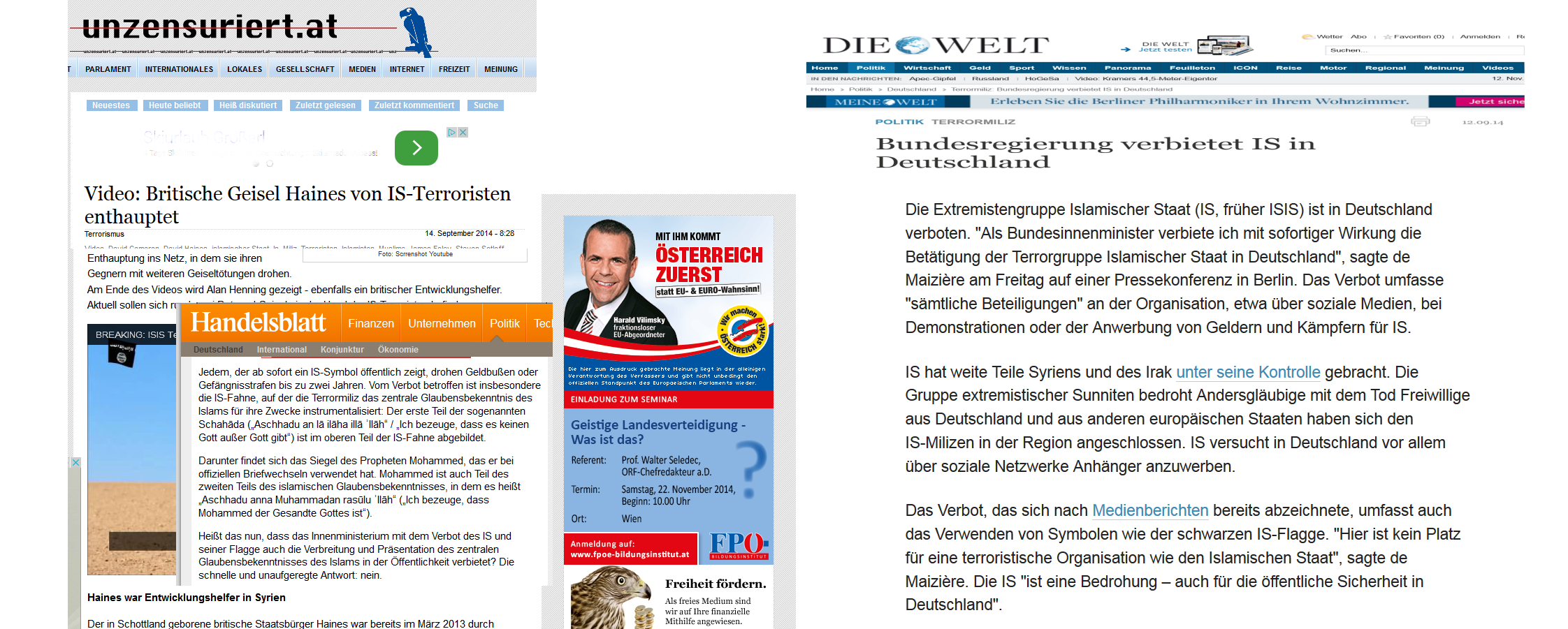 Noch nicht, also in Österreich, aber in Deutschland könnte die gesinnungsgemäß zensierte Website der identitären Gemein-Schaft wohl bereits einem Gerichtsverfahren ausgesetzt sein, für das Verbreiten von IS-Symbolen, und zu einer Geldstrafe respektive Haftstrafe bis zu zwei Jahren verurteilt werden. Für das Verbreiten eines IS-Mordpropagandavideos seit dem 14. September 2014. Wie in der Collage gesehen werden kann, ist dieses IS-Propagandavideo nach wie vor direkt auf „Unzensuriert“ abspielbar, also auch heute noch, am 12. November 2014 …