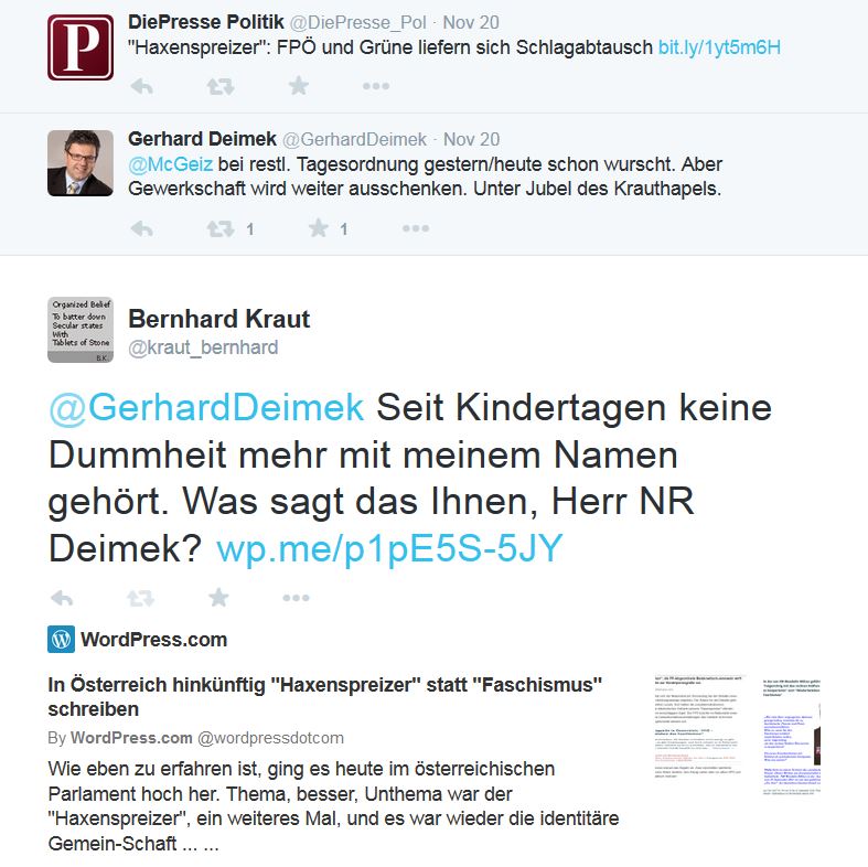 Aber NR Gerhard Deimek bedarf im Grunde des Schutzes gegen ein derartiges Mobbing nicht. Denn er findet und fand bereits die allzu parteikernkompetenzliche Antwort darauf, die er nicht dem Mobber direkt gab, sondern anderen gegenüber äußerte: „Selbsternannte Künstlerin Kraupthappel“. „Unter Jubel des Krauthapels“.