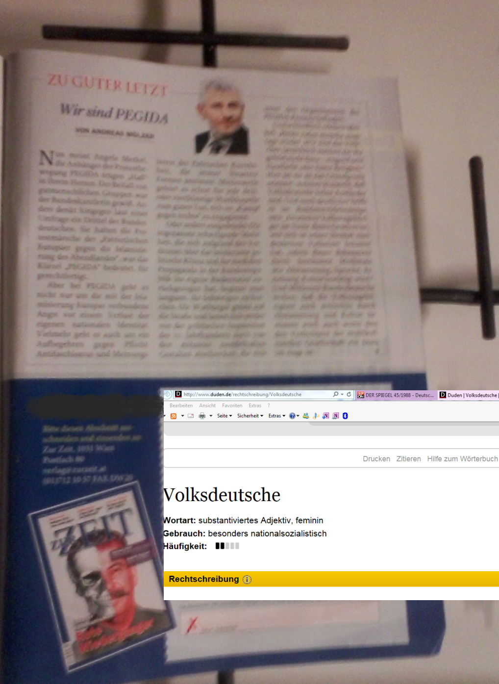 Es ist wieder einmal bezeichnend, daß Andreas Mölzer den Begriff Volksdeutsche verwendet. Die Geschichte des Begriffes ist leicht zu recherchieren, und die Suchergebnisse werden nicht überraschen. Es wäre tatsächlich überraschend, wenn es bei einem aus der identitären Gemein-Schaft einmal anders wäre … Der Duden beispielsweise führt für den Begriff Volksdeutsche an: „Gebrauch: besonders nationalsozialistisch“ …