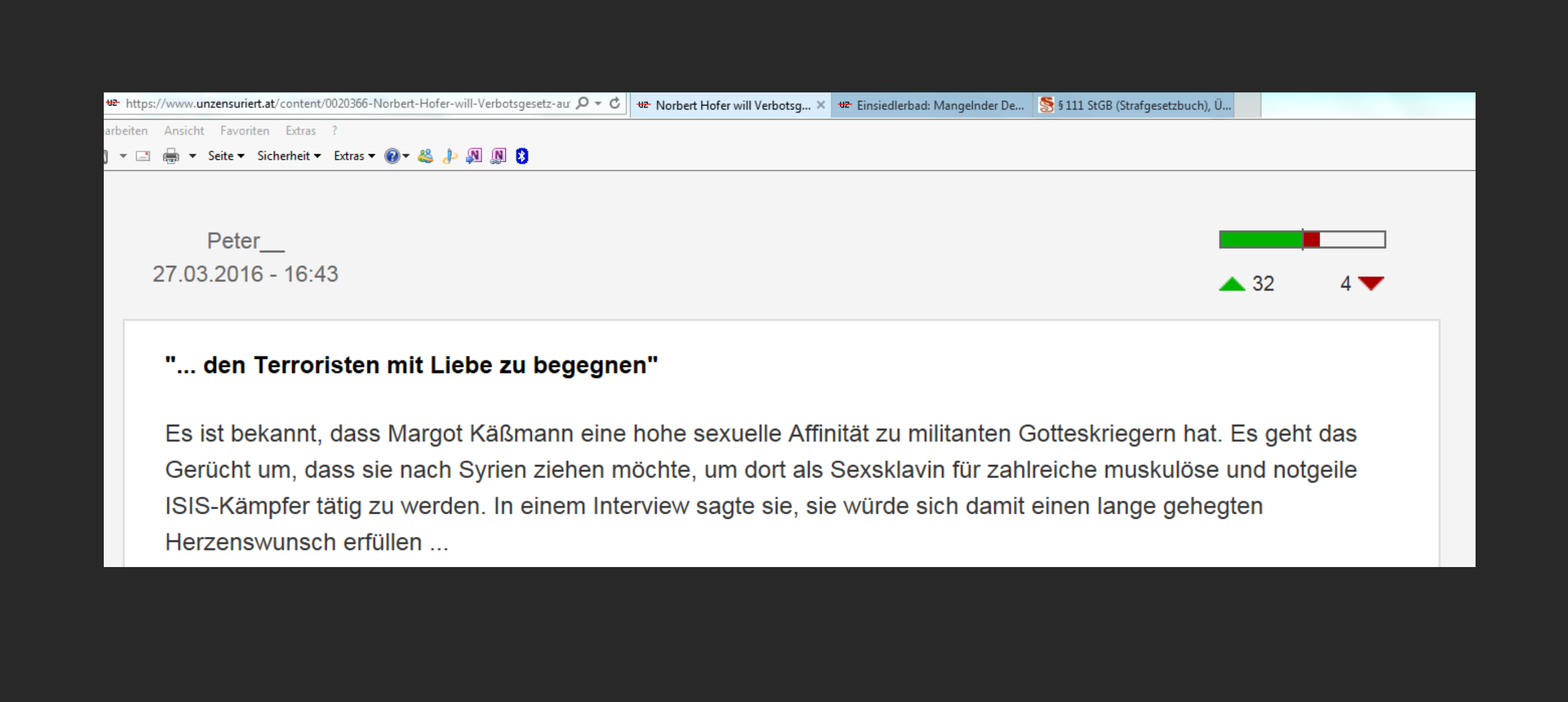 Auch die Kommentare der Schreibstaffel der FPÖ unzensuriert zu dem Kommentar über das hoferische Vorpreschen bezüglich Ausweitung des Verbotsgesetzes vom 27. März 2016 zeigen aktuell, aber doch bloß wieder einmal deutlich auf, daß es keinen Mangel an entsprechenden Gesetzen gibt. Ganz im Gegenteil. Aber das hindert die Schreibstaffel nicht, derartige Kommentare zu schreiben. Und vor allem, es hindert die FPÖ unzensuriert nicht daran, derartige Kommentare veröffentlicht zu lassen.