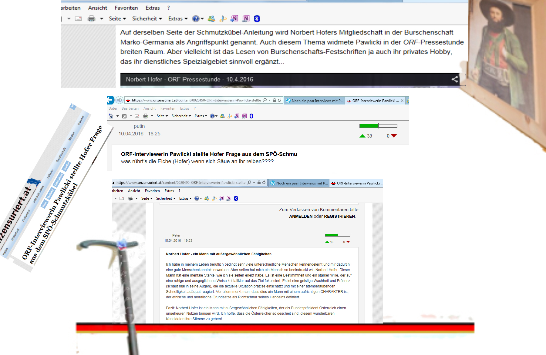 „Auf derselben Seite der Schmutzkübel-Anleitung wird Norbert Hofers Mitgliedschaft in der Burschenschaft Marko-Germania als Angriffspunkt genannt. Auch diesem Thema widmete Pawlicki in der ORF-Pressestunde breiten Raum.“